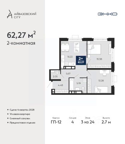 Продаётся 2-комнатная квартира в строящемся доме (ГП-4), срок сдачи: IV-кв. 2027, общей площадью 62.64 кв.м., на 12 этаже. Расположение, транспортная доступность