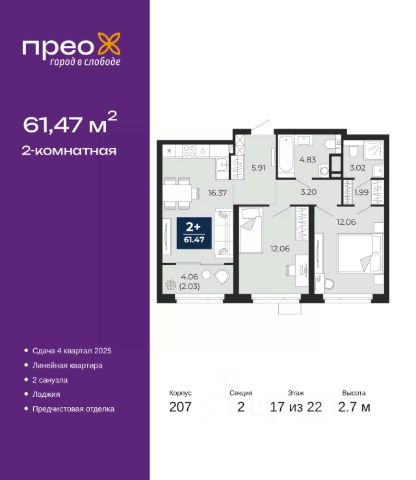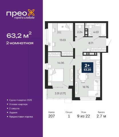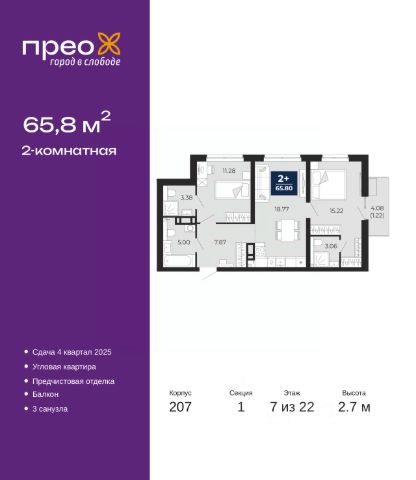 2-комн. квартира от застройщика с предчистовой отделкой в ЖК "Прео" на 15 этаже. Общая площадь: 59.26 кв.м., жилая: 23.26 кв.м., площадь просторной кухни-столовой: 15.77 кв.м. Угловая квартира, идеально подойдет любителям тишины и панорамных видов. В квартире одна лоджия, один раздельный санузел. Высота потолков 2.7 м. Дом монолитный, двухподъездный, высотой 22 этажа. Квартира находится во 2-й секции в корпусе 207. На этаже 8 квартир. В подъезде 1 пассажирский и 1 грузовой лифт. Окончание строительства - 4 квартал 2025 года. Оформление сделки по договору долевого участия. Преображенский — один из самых привлекательных районов для жизни! Это полностью самостоятельный жилой район с точки зрения инфраструктуры. Преображенский находится между Московским и Червишевским трактами в квартале улиц Закалужская — Вьюжная — Александра Протозанова. Не нужно ждать, когда появится инфраструктура — переезжайте на всё готовое. Вблизи расположены действующие школа и детский сад. В этом году откроется еще один сад, а в следующем году — школа. По соседству с Преображенским запланировано строительство городского парка "Комарово" площадью 38 гектар. За 10 минут можно доехать на автомобиле до крупных ТРЦ: "Лента", "Кристалл", "Леруа Мерлен", "Метро" и "Ашан". С 2018 года в районе открыт Соседский центр — пространство, созданное для формирования добрососедской среды, совместного досуга, общения и реализации соседских инициатив. Здесь проходят встречи соседей, а также сами жители района организовывают мероприятия. Организатором такого события может стать любой желающий. В квартирах выполнена качественная предчистовая отделка. Гладкие стены с финишным выравниванием по маякам. Ровный потолок для установки натяжного потолка. Установлены пятикамерные окна с двойным стеклопакетом (3 стекла). Дизайнерские холлы с видеонаблюдением, безбарьерным и прозрачным входом всегда светло и спокойно. На первом этаже есть просторные колясочные, где все жители могут оставлять свои коляски и велосипеды. В Преображенском есть всё, что нужно для активного отдыха и занятий спортом. Мы сделали большое футбольное поле с безопасным покрытием. Также установили хоккейный корт, который оборудован по всем необходимым стандартам. Во дворах можно делать упражнения на специальных площадках с турниками. Весь район мы обустроили велодорожками, которые связаны в единый маршрут. У нас есть сухие фонтаны, бьющие из земли, деревья, веревки, сетки, скалодром, газон, песок и резинка — осталось просто дать своему ребенку право на свободную игру. По-настоящему хорошие дворы — это те, которые дети предпочитают соцсетям и телевизору. Аккредитация в банках: ПАО Банк "ВТБ", ПАО "Газпромбанк", ОАО "Альфа-Банк", "Сбербанк России", ПАО "Банк Уралсиб" и других. #2uFIFF Продается квартира в новостройке с отделкой в микрорайоне Тюменская Слобода в городе Тюмень.