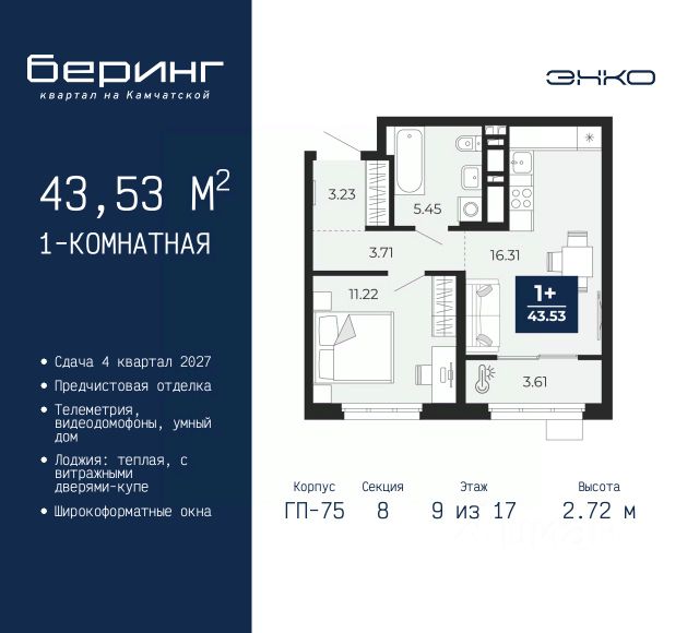 Успейте забронировать по этой цене, период предложения ограничен! Стоимость квартиры указана со скидкой, ваша экономия составит 299,500 руб. Звоните, мы вам все подробно расскажем. 1-комн. квартира с предчистовой отделкой в ЖК "Беринг" на 2 этаже. Общая площадь: 45.14 кв.м., жилая: 11.84 кв.м., площадь просторной кухни-столовой: 15.3 кв.м. Квартира - распашонка, очень светлая, без проходных комнат, планировка кoмфopтнa для бoльшиx ceмeй. В квартире один балкон, один совмещенный санузел. Высота потолков 2.72 м. Дом монолитный, многоподъездный, переменной этажности, от 17 до 24 этажей. Квартира находится в 7-й секции высотой 19 этажей в корпусе ГП-75. На этаже 7 квартир. В подъезде 2 пассажирских и 1 грузовой лифт. Окончание строительства - 4 квартал 2027 года. Оформление сделки по договору долевого участия. Подобно знаменитому исследователю, мы чувствуем себя первооткрывателями этой локации. Хотим показать новую суть места, сформировать для вас жизненный опыт, которого ещё не было. Беринг — район зелёного цвета. Беринг — район, который откроется вам с другой стороны. Впечатлит новым уровнем комфорта и качеством жизни. Беринг — открытие на карте города. Первый квартал расположен в районе Тура, в границах улиц: Камчатская Западносибирская Энтузиастов. Вокруг уже есть всё для того, чтобы ежедневная рутина была лишь частью жизни и не доставляла дискомфорта. Школы и детские сады, магазины и аптеки, поликлиника, места для семейного отдыха, пеших и велопрогулок, и даже рыбалки. Масштабное озеленение дворов — визитная карточка ЭНКО и ваш оазис спокойствия, чтобы отвлечься от повседневности. Раскидистые деревья, кустарники, травы и цветы — осталось остановиться, вдохнуть и расслабиться, глядя на эту природную красоту. Стилистика подъездов продолжает концепцию Беринга, вдохновлённого Камчаткой: сдержанный, но при этом впечатляющий дизайн соседствует с удобством и функциональностью. #zmg9ST