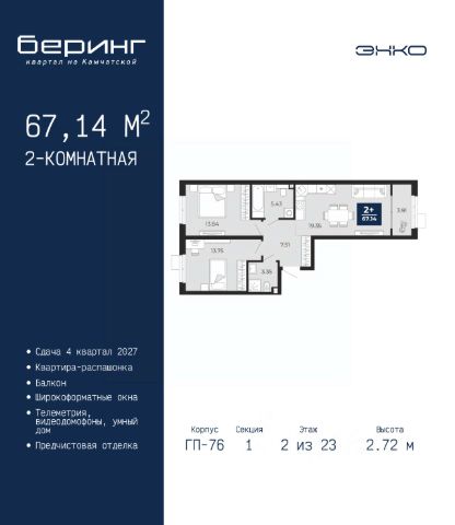Успейте оформить бронирование на этих условиях, период акции ограничен! Стоимость квартиры указана со скидкой, ваша экономия составит 328,383 руб. Информация по телефону, наши менеджеры вам все расскажут. 1-комн. квартира в ЖК "Беринг" на 7 этаже. Общая площадь: 47.55 кв.м. Высота потолков 2.75 м. Дом монолитный, многоподъездный, переменной этажности, от 9 до 21 этажей. Квартира находится в 74.5-й секции высотой 21 этаж в корпусе ГП-74. На этаже 7 квартир. В подъезде 1 пассажирский и 1 грузовой лифт. Окончание строительства - 1 квартал 2026 года. Оформление сделки по договору долевого участия. Подобно знаменитому исследователю, мы чувствуем себя первооткрывателями этой локации. Хотим показать новую суть места, сформировать для вас жизненный опыт, которого ещё не было. Беринг — район зелёного цвета. Беринг — район, который откроется вам с другой стороны. Впечатлит новым уровнем комфорта и качеством жизни. Беринг — открытие на карте города. Первый квартал расположен в районе Тура, в границах улиц: Камчатская Западносибирская Энтузиастов. Вокруг уже есть всё для того, чтобы ежедневная рутина была лишь частью жизни и не доставляла дискомфорта. Школы и детские сады, магазины и аптеки, поликлиника, места для семейного отдыха, пеших и велопрогулок, и даже рыбалки. Масштабное озеленение дворов — визитная карточка ЭНКО и ваш оазис спокойствия, чтобы отвлечься от повседневности. Раскидистые деревья, кустарники, травы и цветы — осталось остановиться, вдохнуть и расслабиться, глядя на эту природную красоту. Стилистика подъездов продолжает концепцию Беринга, вдохновлённого Камчаткой: сдержанный, но при этом впечатляющий дизайн соседствует с удобством и функциональностью. #26Dett