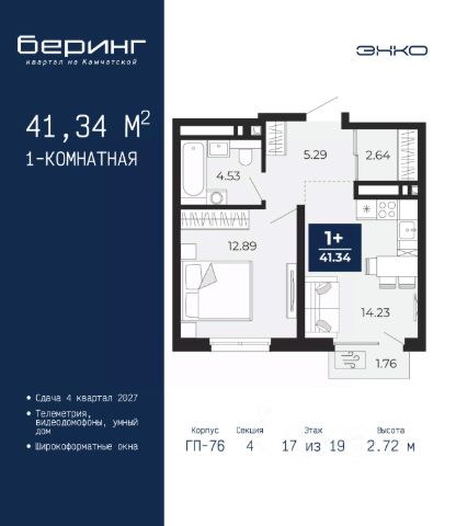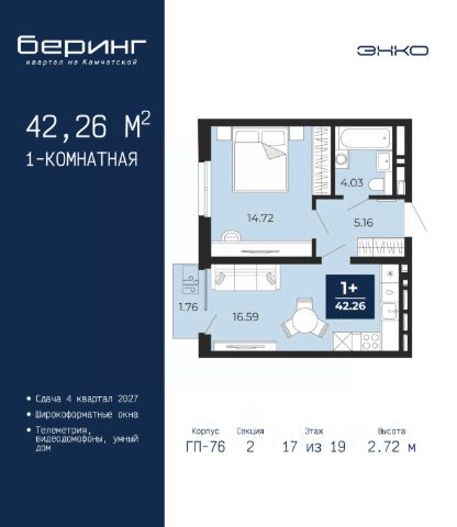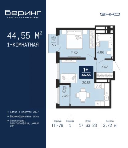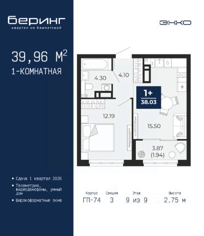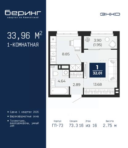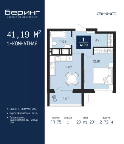 Спешите оформить бронирование на этих условиях, предложение ограничено! Стоимость квартиры указана со скидкой, ваша экономия составит 328,383 руб. Звоните, мы вам все подробно расскажем. Продается 1-комн. квартира от застройщика в ЖК "Беринг" на 7 этаже. Общая площадь: 47.55 кв.м. Высота потолков 2.75 м. Дом монолитный, многоподъездный, переменной этажности, от 9 до 21 этажей. Квартира находится в 74.5-й секции высотой 21 этаж в корпусе ГП-74. На этаже 7 квартир. В подъезде 1 пассажирский и 1 грузовой лифт. Окончание строительства - 1 квартал 2026 года. Оформление сделки по договору долевого участия. Подобно знаменитому исследователю, мы чувствуем себя первооткрывателями этой локации. Хотим показать новую суть места, сформировать для вас жизненный опыт, которого ещё не было. Беринг — район зелёного цвета. Беринг — район, который откроется вам с другой стороны. Впечатлит новым уровнем комфорта и качеством жизни. Беринг — открытие на карте города. Первый квартал расположен в районе Тура, в границах улиц: Камчатская Западносибирская Энтузиастов. Вокруг уже есть всё для того, чтобы ежедневная рутина была лишь частью жизни и не доставляла дискомфорта. Школы и детские сады, магазины и аптеки, поликлиника, места для семейного отдыха, пеших и велопрогулок, и даже рыбалки. Масштабное озеленение дворов — визитная карточка ЭНКО и ваш оазис спокойствия, чтобы отвлечься от повседневности. Раскидистые деревья, кустарники, травы и цветы — осталось остановиться, вдохнуть и расслабиться, глядя на эту природную красоту. Стилистика подъездов продолжает концепцию Беринга, вдохновлённого Камчаткой: сдержанный, но при этом впечатляющий дизайн соседствует с удобством и функциональностью. #z6dEtT