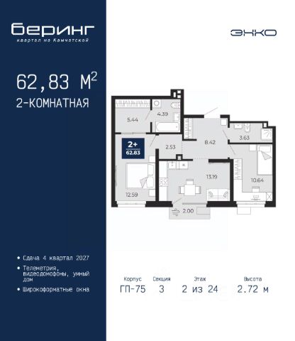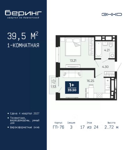 Торопитесь забронировать на этих условиях, срок предложения ограничен! Стоимость квартиры указана со скидкой, ваша экономия составит 278,214 руб. Информация по телефону, мы вам все подробно расскажем. Однокомнатная квартира в ЖК "Беринг" на 17 этаже. Общая площадь: 40.76 кв.м. Высота потолков 2.72 м. Дом монолитный, черырехподъездный, переменной этажности, от 19 до 24 этажей. Квартира находится в 1-й секции высотой 23 этажа в корпусе ГП-76. На этаже 7 квартир. В подъезде 2 пассажирских и 1 грузовой лифт. Окончание строительства - 4 квартал 2027 года. Оформление сделки по договору долевого участия. Подобно знаменитому исследователю, мы чувствуем себя первооткрывателями этой локации. Хотим показать новую суть места, сформировать для вас жизненный опыт, которого ещё не было. Беринг — район зелёного цвета. Беринг — район, который откроется вам с другой стороны. Впечатлит новым уровнем комфорта и качеством жизни. Беринг — открытие на карте города. Первый квартал расположен в районе Тура, в границах улиц: Камчатская Западносибирская Энтузиастов. Вокруг уже есть всё для того, чтобы ежедневная рутина была лишь частью жизни и не доставляла дискомфорта. Школы и детские сады, магазины и аптеки, поликлиника, места для семейного отдыха, пеших и велопрогулок, и даже рыбалки. Масштабное озеленение дворов — визитная карточка ЭНКО и ваш оазис спокойствия, чтобы отвлечься от повседневности. Раскидистые деревья, кустарники, травы и цветы — осталось остановиться, вдохнуть и расслабиться, глядя на эту природную красоту. Стилистика подъездов продолжает концепцию Беринга, вдохновлённого Камчаткой: сдержанный, но при этом впечатляющий дизайн соседствует с удобством и функциональностью. #ZMDDv1