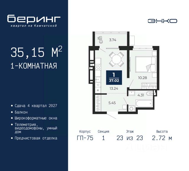 Продается 2-комн. квартира с предчистовой отделкой в ЖК "Беринг" на 9 этаже. Общая площадь: 53.72 кв.м., жилая: 20.97 кв.м., площадь просторной кухни-столовой: 15.95 кв.м. Комнаты изолированные, все окна выходят на одну сторону. В квартире один балкон, один совмещенный санузел. Высота потолков 2.72 м. Дом монолитный, многоподъездный, переменной этажности, от 17 до 24 этажей. Квартира находится в 1-й секции высотой 23 этажа в корпусе ГП-75. На этаже 8 квартир. В подъезде 2 пассажирских и 1 грузовой лифт. Окончание строительства - 4 квартал 2027 года. Оформление сделки по договору долевого участия. Подобно знаменитому исследователю, мы чувствуем себя первооткрывателями этой локации. Хотим показать новую суть места, сформировать для вас жизненный опыт, которого ещё не было. Беринг — район зелёного цвета. Беринг — район, который откроется вам с другой стороны. Впечатлит новым уровнем комфорта и качеством жизни. Беринг — открытие на карте города. Первый квартал расположен в районе Тура, в границах улиц: Камчатская Западносибирская Энтузиастов. Вокруг уже есть всё для того, чтобы ежедневная рутина была лишь частью жизни и не доставляла дискомфорта. Школы и детские сады, магазины и аптеки, поликлиника, места для семейного отдыха, пеших и велопрогулок, и даже рыбалки. Масштабное озеленение дворов — визитная карточка ЭНКО и ваш оазис спокойствия, чтобы отвлечься от повседневности. Раскидистые деревья, кустарники, травы и цветы — осталось остановиться, вдохнуть и расслабиться, глядя на эту природную красоту. Стилистика подъездов продолжает концепцию Беринга, вдохновлённого Камчаткой: сдержанный, но при этом впечатляющий дизайн соседствует с удобством и функциональностью. #269gTF