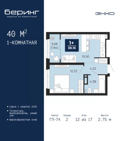 Торопитесь забронировать на этих условиях, срок предложения ограничен! Стоимость квартиры указана со скидкой, ваша экономия составит 278,214 руб. Информация по телефону, мы вам все подробно расскажем. Однокомнатная квартира в ЖК "Беринг" на 17 этаже. Общая площадь: 40.76 кв.м. Высота потолков 2.72 м. Дом монолитный, черырехподъездный, переменной этажности, от 19 до 24 этажей. Квартира находится в 1-й секции высотой 23 этажа в корпусе ГП-76. На этаже 7 квартир. В подъезде 2 пассажирских и 1 грузовой лифт. Окончание строительства - 4 квартал 2027 года. Оформление сделки по договору долевого участия. Подобно знаменитому исследователю, мы чувствуем себя первооткрывателями этой локации. Хотим показать новую суть места, сформировать для вас жизненный опыт, которого ещё не было. Беринг — район зелёного цвета. Беринг — район, который откроется вам с другой стороны. Впечатлит новым уровнем комфорта и качеством жизни. Беринг — открытие на карте города. Первый квартал расположен в районе Тура, в границах улиц: Камчатская Западносибирская Энтузиастов. Вокруг уже есть всё для того, чтобы ежедневная рутина была лишь частью жизни и не доставляла дискомфорта. Школы и детские сады, магазины и аптеки, поликлиника, места для семейного отдыха, пеших и велопрогулок, и даже рыбалки. Масштабное озеленение дворов — визитная карточка ЭНКО и ваш оазис спокойствия, чтобы отвлечься от повседневности. Раскидистые деревья, кустарники, травы и цветы — осталось остановиться, вдохнуть и расслабиться, глядя на эту природную красоту. Стилистика подъездов продолжает концепцию Беринга, вдохновлённого Камчаткой: сдержанный, но при этом впечатляющий дизайн соседствует с удобством и функциональностью. #ZMDDv1