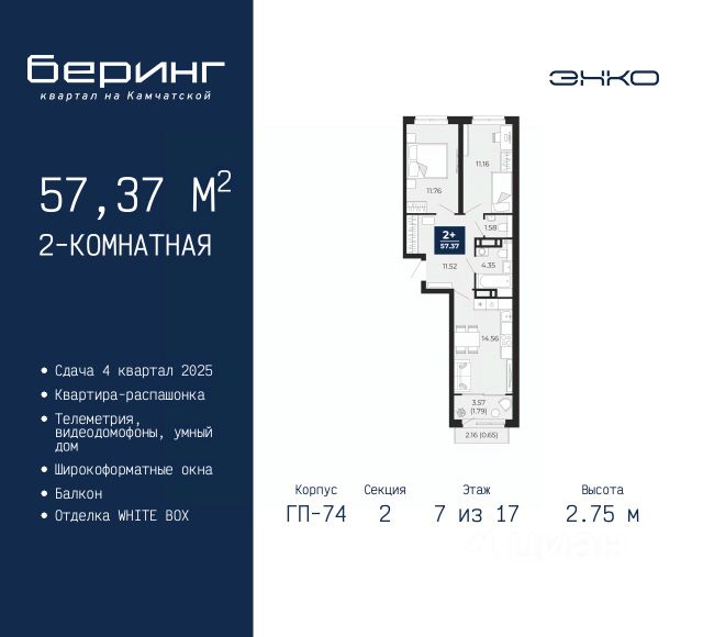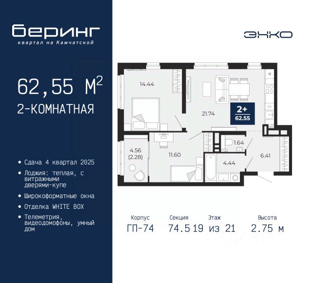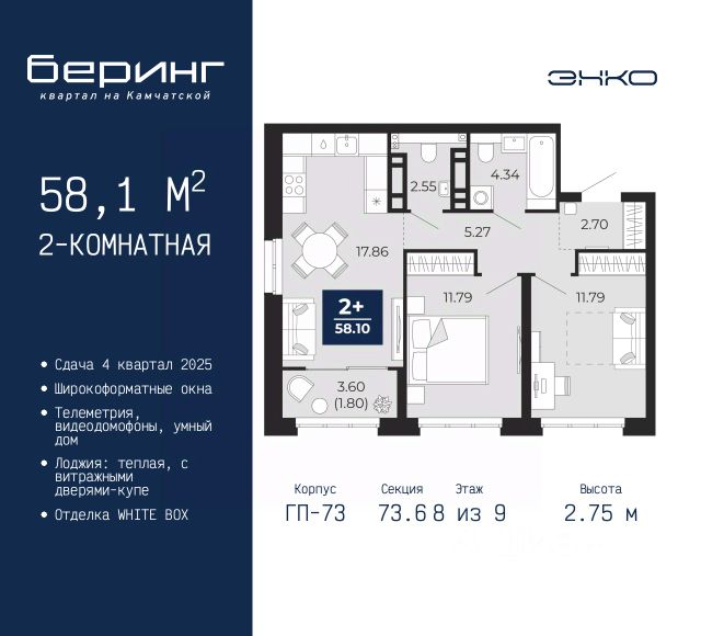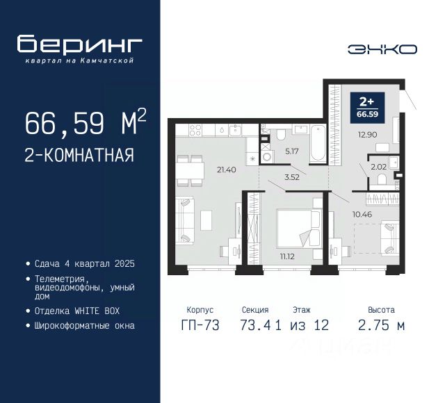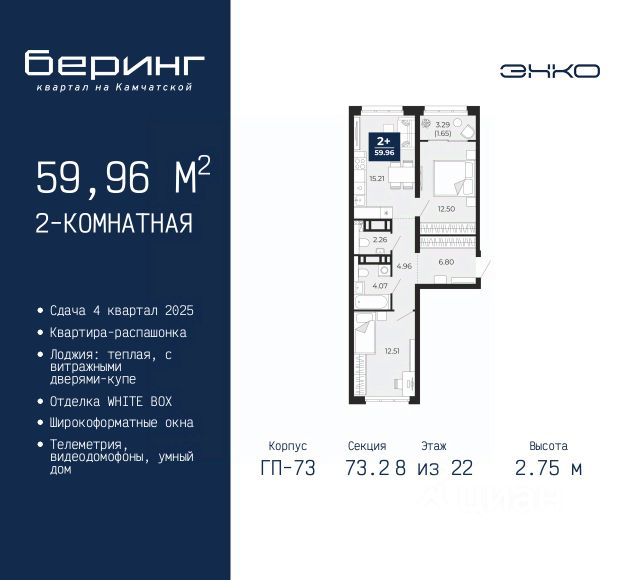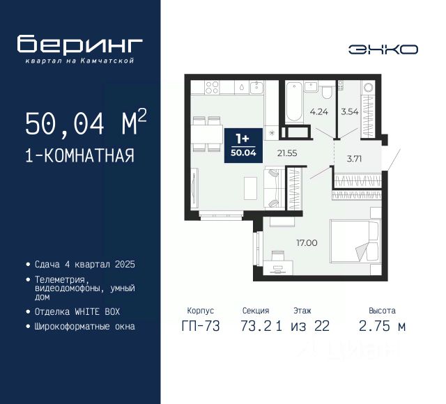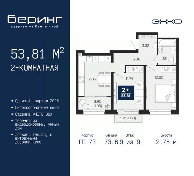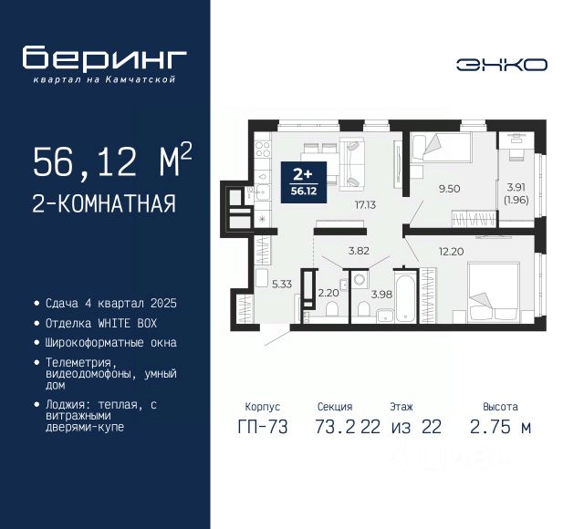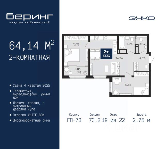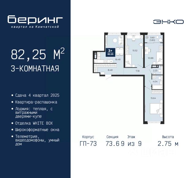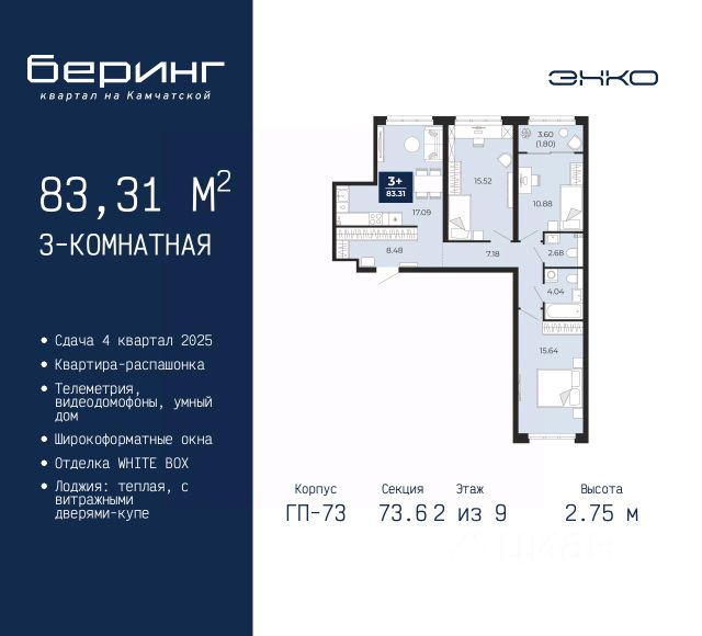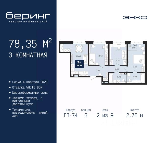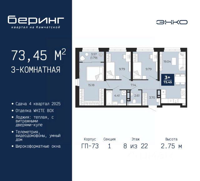 3-комн. квартира в ЖК "Беринг" на 8 этаже. Квартира без отделки, полностью готова к ремонту. Общая площадь: 73.45 кв.м., жилая: 34.76 кв.м., площадь просторной кухни-столовой: 19.04 кв.м. Угловая квартира, идеально подойдет любителям тишины и панорамных видов. В квартире одна лоджия, один совмещенный и один раздельный санузел. Высота потолков 2.75 м. Дом монолитный, многоподъездный, переменной этажности, от 9 до 22 этажей. Квартира находится в 1-й секции высотой 22 этажа в корпусе ГП-73. На этаже 5 квартир. В подъезде 1 пассажирский и 1 грузовой лифт. Окончание строительства - 4 квартал 2025 года. Оформление сделки по договору долевого участия. Подобно знаменитому исследователю, мы чувствуем себя первооткрывателями этой локации. Хотим показать новую суть места, сформировать для вас жизненный опыт, которого ещё не было. Беринг — район зелёного цвета. Беринг — район, который откроется вам с другой стороны. Впечатлит новым уровнем комфорта и качеством жизни. Беринг — открытие на карте города. Первый квартал расположен в районе Тура, в границах улиц: Камчатская Западносибирская Энтузиастов. Вокруг уже есть всё для того, чтобы ежедневная рутина была лишь частью жизни и не доставляла дискомфорта. Школы и детские сады, магазины и аптеки, поликлиника, места для семейного отдыха, пеших и велопрогулок, и даже рыбалки. Масштабное озеленение дворов — визитная карточка ЭНКО и ваш оазис спокойствия, чтобы отвлечься от повседневности. Раскидистые деревья, кустарники, травы и цветы — осталось остановиться, вдохнуть и расслабиться, глядя на эту природную красоту. Стилистика подъездов продолжает концепцию Беринга, вдохновлённого Камчаткой: сдержанный, но при этом впечатляющий дизайн соседствует с удобством и функциональностью. #2SfMWb