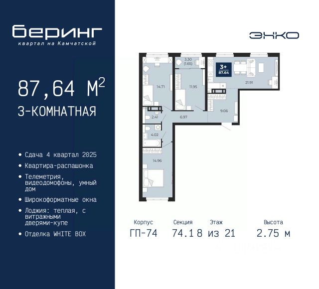 3-комн. квартира в ЖК "Беринг" на 8 этаже. Квартира без отделки, полностью готова к ремонту. Общая площадь: 73.45 кв.м., жилая: 34.76 кв.м., площадь просторной кухни-столовой: 19.04 кв.м. Угловая квартира, идеально подойдет любителям тишины и панорамных видов. В квартире одна лоджия, один совмещенный и один раздельный санузел. Высота потолков 2.75 м. Дом монолитный, многоподъездный, переменной этажности, от 9 до 22 этажей. Квартира находится в 1-й секции высотой 22 этажа в корпусе ГП-73. На этаже 5 квартир. В подъезде 1 пассажирский и 1 грузовой лифт. Окончание строительства - 4 квартал 2025 года. Оформление сделки по договору долевого участия. Подобно знаменитому исследователю, мы чувствуем себя первооткрывателями этой локации. Хотим показать новую суть места, сформировать для вас жизненный опыт, которого ещё не было. Беринг — район зелёного цвета. Беринг — район, который откроется вам с другой стороны. Впечатлит новым уровнем комфорта и качеством жизни. Беринг — открытие на карте города. Первый квартал расположен в районе Тура, в границах улиц: Камчатская Западносибирская Энтузиастов. Вокруг уже есть всё для того, чтобы ежедневная рутина была лишь частью жизни и не доставляла дискомфорта. Школы и детские сады, магазины и аптеки, поликлиника, места для семейного отдыха, пеших и велопрогулок, и даже рыбалки. Масштабное озеленение дворов — визитная карточка ЭНКО и ваш оазис спокойствия, чтобы отвлечься от повседневности. Раскидистые деревья, кустарники, травы и цветы — осталось остановиться, вдохнуть и расслабиться, глядя на эту природную красоту. Стилистика подъездов продолжает концепцию Беринга, вдохновлённого Камчаткой: сдержанный, но при этом впечатляющий дизайн соседствует с удобством и функциональностью. #2SfMWb