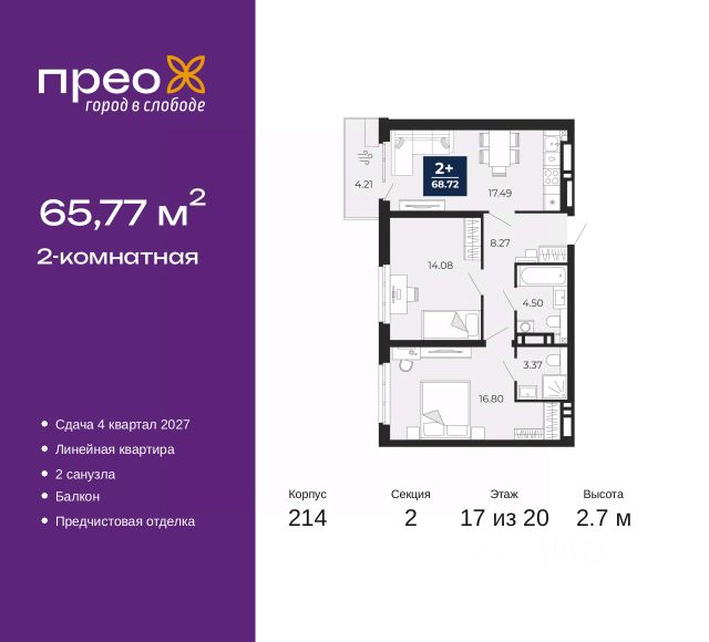 2-комн. квартира с предчистовой отделкой в ЖК "Прео" на 2 этаже. Общая площадь: 63.68 кв.м., жилая: 26.74 кв.м., площадь просторной кухни-столовой: 18.04 кв.м. Комнаты изолированные, все окна выходят на одну сторону. В квартире одна лоджия, один совмещенный и один раздельный санузел. Высота потолков 2.7 м. Дом монолитный, двухподъездный, переменной этажности, от 12 до 20 этажей. Квартира находится в 1-й секции высотой 12 этажей в корпусе 214. На этаже 8 квартир. В подъезде 1 пассажирский и 1 грузовой лифт. Окончание строительства - 4 квартал 2027 года. Оформление сделки по договору долевого участия. Преображенский — один из самых привлекательных районов для жизни! Это полностью самостоятельный жилой район с точки зрения инфраструктуры. Преображенский находится между Московским и Червишевским трактами в квартале улиц Закалужская — Вьюжная — Александра Протозанова. Не нужно ждать, когда появится инфраструктура — переезжайте на всё готовое. Вблизи расположены действующие школа и детский сад. В этом году откроется еще один сад, а в следующем году — школа. По соседству с Преображенским запланировано строительство городского парка "Комарово" площадью 38 гектар. За 10 минут можно доехать на автомобиле до крупных ТРЦ: "Лента", "Кристалл", "Леруа Мерлен", "Метро" и "Ашан". С 2018 года в районе открыт Соседский центр — пространство, созданное для формирования добрососедской среды, совместного досуга, общения и реализации соседских инициатив. Здесь проходят встречи соседей, а также сами жители района организовывают мероприятия. Организатором такого события может стать любой желающий. В квартирах выполнена качественная предчистовая отделка. Гладкие стены с финишным выравниванием по маякам. Ровный потолок для установки натяжного потолка. Установлены пятикамерные окна с двойным стеклопакетом (3 стекла). Дизайнерские холлы с видеонаблюдением, безбарьерным и прозрачным входом всегда светло и спокойно. На первом этаже есть просторные колясочные, где все жители могут оставлять свои коляски и велосипеды. В Преображенском есть всё, что нужно для активного отдыха и занятий спортом. Мы сделали большое футбольное поле с безопасным покрытием. Также установили хоккейный корт, который оборудован по всем необходимым стандартам. Во дворах можно делать упражнения на специальных площадках с турниками. Весь район мы обустроили велодорожками, которые связаны в единый маршрут. У нас есть сухие фонтаны, бьющие из земли, деревья, веревки, сетки, скалодром, газон, песок и резинка — осталось просто дать своему ребенку право на свободную игру. По-настоящему хорошие дворы — это те, которые дети предпочитают соцсетям и телевизору. Аккредитация в банках: ПАО "Банк Уралсиб", ПАО Банк "ВТБ", ПАО "Газпромбанк", ОАО "Альфа-Банк", "Сбербанк России" и других. #ZmvgM6 Продается квартира в новостройке в микрорайоне Тюменская Слобода в городе Тюмень.
