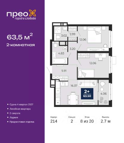 2-комн. квартира с предчистовой отделкой в ЖК "Прео" на 8 этаже. Общая площадь: 63.5 кв.м., жилая: 24.12 кв.м., площадь просторной кухни-столовой: 16.37 кв.м. Комнаты изолированные, все окна выходят на одну сторону. В квартире одна лоджия, два совмещенных санузла. Высота потолков 2.7 м. Дом монолитный, двухподъездный, переменной этажности, от 12 до 20 этажей. Квартира находится во 2-й секции высотой 20 этажей в корпусе 214. На этаже 8 квартир. В подъезде 1 пассажирский и 1 грузовой лифт. Окончание строительства - 4 квартал 2027 года. Оформление сделки по договору долевого участия. Преображенский — один из самых привлекательных районов для жизни! Это полностью самостоятельный жилой район с точки зрения инфраструктуры. Преображенский находится между Московским и Червишевским трактами в квартале улиц Закалужская — Вьюжная — Александра Протозанова. Не нужно ждать, когда появится инфраструктура — переезжайте на всё готовое. Вблизи расположены действующие школа и детский сад. В этом году откроется еще один сад, а в следующем году — школа. По соседству с Преображенским запланировано строительство городского парка "Комарово" площадью 38 гектар. За 10 минут можно доехать на автомобиле до крупных ТРЦ: "Лента", "Кристалл", "Леруа Мерлен", "Метро" и "Ашан". С 2018 года в районе открыт Соседский центр — пространство, созданное для формирования добрососедской среды, совместного досуга, общения и реализации соседских инициатив. Здесь проходят встречи соседей, а также сами жители района организовывают мероприятия. Организатором такого события может стать любой желающий. В квартирах выполнена качественная предчистовая отделка. Гладкие стены с финишным выравниванием по маякам. Ровный потолок для установки натяжного потолка. Установлены пятикамерные окна с двойным стеклопакетом (3 стекла). Дизайнерские холлы с видеонаблюдением, безбарьерным и прозрачным входом всегда светло и спокойно. На первом этаже есть просторные колясочные, где все жители могут оставлять свои коляски и велосипеды. В Преображенском есть всё, что нужно для активного отдыха и занятий спортом. Мы сделали большое футбольное поле с безопасным покрытием. Также установили хоккейный корт, который оборудован по всем необходимым стандартам. Во дворах можно делать упражнения на специальных площадках с турниками. Весь район мы обустроили велодорожками, которые связаны в единый маршрут. У нас есть сухие фонтаны, бьющие из земли, деревья, веревки, сетки, скалодром, газон, песок и резинка — осталось просто дать своему ребенку право на свободную игру. По-настоящему хорошие дворы — это те, которые дети предпочитают соцсетям и телевизору. Аккредитация в банках: "Сбербанк России", ПАО "Банк Уралсиб", ПАО "Газпромбанк", ОАО "Альфа-Банк", ПАО Банк "ВТБ" и других. #z6eoa9
