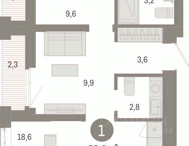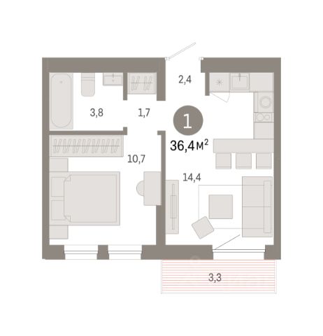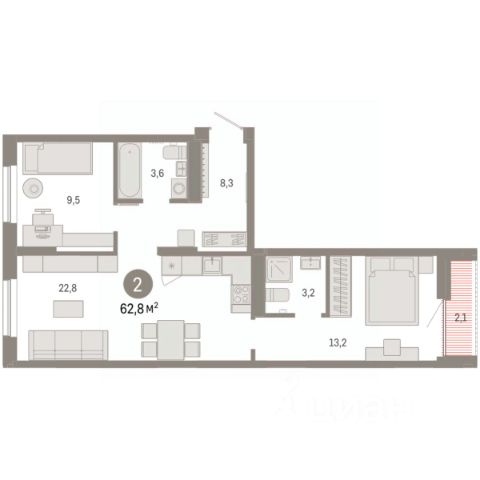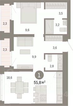 Квартира с кухней-гостиной и двумя спальнями в кварталах "На Минской". Особенности планировки: балкон, вид во двор, гардеробная, мастер-спальня, предчистовая отделка, разнесённые спальни.