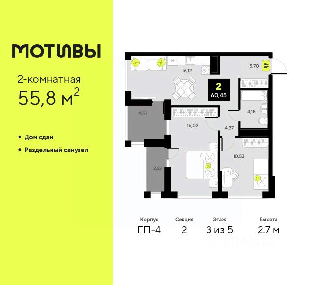 Просторная двухкомнатная квартира с предчистовой отделкой в ЖК "Мотивы" на 3 этаже. Общая площадь: 55.8 кв.м. Высота потолков 2.7 м. Квартира будет сдаваться с предчистовой отделкой White Box: выровнены и оштукатурены стены, проведено электричество и отопление, установлены радиаторы. Вы также можете приобрести квартиру с ремонтом от застройщика, представленным в трех цветовых решениях Scandi, Wood и Coffee и включающим ламинат, обои под покраску, двери, натяжной потолок и санузел с сантехникой. При желании вы можете заказать отделку под ключ, варианты возможных решений представлены в альбоме фотографий. Дом монолитный, многоподъездный, переменной этажности, от 5 до 14 этажей. Квартира находится во 2-й секции высотой 5 этажей в корпусе ГП-4. На этаже 5 квартир. В подъезде 1 грузовой лифт. На сегодняшний день строительство окончено, дом сдан в 4 квартале 2024 года. Оформление сделки по договору купли-продажи. Закрытая от автомобилей территория, безопасный двор и камеры видеонаблюдения - гаранты вашего спокойствия. Квартал будет располагать богатой инфраструктурой: на первых этажах разместятся магазины, пекарни, кофейни, пункты выдачи, аптеки, детские центры, цветочные салоны и многое другое, что сделает жизнь поистине комфортной. Рядом находится парк общей площадью почти 5000 м², в котором располагаются локации для игр и отдыха жителей, здесь можно совершить утреннюю пробежку или прогуляться после рабочего дня. В парке есть зона воркаута с тренажерами для взрослых, игровые комплексы с горками и канатный комплекс для детей разных возрастов, качели и лавочки для отдыха, площадки для командных видов спорта и для панна-футбола. В ЖК "Мотивы" всё продумано до мелочей: светлые холлы входных групп, оформленные в едином стиле, просторные колясочные, лапомойки для питомцев. На территории комплекса находятся 2 8-ми этажных паркинга и более 1000 м/м на открытой парковке. Жилой комплекс находится в одном из экологически благоприятных районов Тюмени, недалеко от Плехановского бора. При этом до центра города можно добраться за 15 минут, а до международного аэропорта Рощино за 13 минут. Окончание строительства: ГП 1, 2, 3, 4 сдача до конца 2024 года, ГП 6, 7, 8 сдача 2 квартал 2026 года. #26dwE4