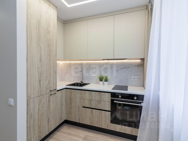 Кухонный гарнитур в светлых тонах с современными и новыми смесителем и раковиной, варочная панель.