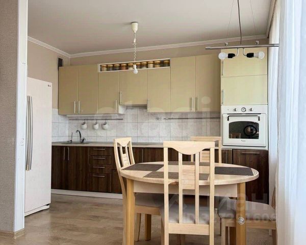 Просторная кухня правильной формы, гостиная 17, м² с окнами на две стороны и выходом на лоджию.