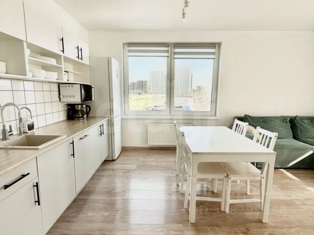 Удобная планировка, кухня гостинная с кухонным гарнитуром и техникой, обеденной зоной, удобным большим раскладным диваном и ТВ зоной.