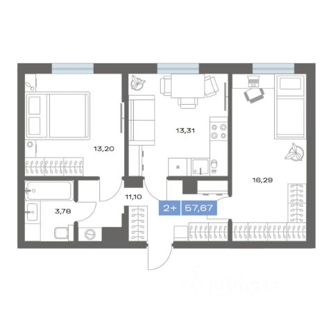 Двухкомнатная квартира с предчистовой отделкой в ЖК "Мириады" на 4 этаже. Общая площадь: 58.9 кв.м. Высота потолков 2.7 м.