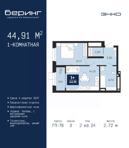 Продается 1-комн. квартира-студия от застройщика с предчистовой отделкой в ЖК "Беринг" на 5 этаже. Общая площадь: 34.32 кв.м., площадь гостиной 22.5 кв.м., из которых 5.79 кв.м. выделено под кухонную зону. Все окна выходят на одну сторону. В квартире одна лоджия, один совмещенный санузел. Высота потолков 2.72 м. Дом монолитный, черырехподъездный, переменной этажности, от 19 до 24 этажей. Квартира находится в 1-й секции высотой 23 этажа в корпусе ГП-76. На этаже 7 квартир. В подъезде 2 пассажирских и 1 грузовой лифт. Окончание строительства - 4 квартал 2027 года. Оформление сделки по договору долевого участия. Подобно знаменитому исследователю, мы чувствуем себя первооткрывателями этой локации. Хотим показать новую суть места, сформировать для вас жизненный опыт, которого ещё не было. Беринг — район зелёного цвета. Беринг — район, который откроется вам с другой стороны. Впечатлит новым уровнем комфорта и качеством жизни. Беринг — открытие на карте города. Первый квартал расположен в районе Тура, в границах улиц: Камчатская Западносибирская Энтузиастов. Вокруг уже есть всё для того, чтобы ежедневная рутина была лишь частью жизни и не доставляла дискомфорта. Школы и детские сады, магазины и аптеки, поликлиника, места для семейного отдыха, пеших и велопрогулок, и даже рыбалки. Масштабное озеленение дворов — визитная карточка ЭНКО и ваш оазис спокойствия, чтобы отвлечься от повседневности. Раскидистые деревья, кустарники, травы и цветы — осталось остановиться, вдохнуть и расслабиться, глядя на эту природную красоту. Стилистика подъездов продолжает концепцию Беринга, вдохновлённого Камчаткой: сдержанный, но при этом впечатляющий дизайн соседствует с удобством и функциональностью. #Zm6bBZ