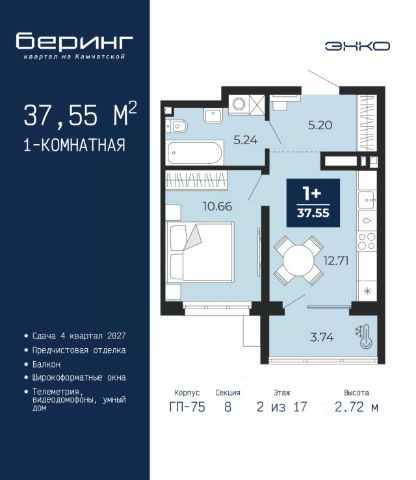 Успейте оформить бронирование, пока действует скидка, предложение ограничено! Стоимость квартиры указана со скидкой, ваша экономия составит 499,073 руб. Звоните, мы вам все подробно расскажем. Однокомнатная квартира-студия с предчистовой отделкой в ЖК "Беринг" на 11 этаже. Общая площадь: 31.39 кв.м., площадь гостиной 15.14 кв.м., из которых 5 кв.м. выделено под кухонную зону. Все окна выходят на одну сторону. В квартире одна лоджия, один совмещенный санузел. Высота потолков 2.75 м. Дом монолитный, многоподъездный, переменной этажности, от 9 до 21 этажей. Квартира находится в 5-й секции высотой 21 этаж в корпусе ГП-74. На этаже 7 квартир. В подъезде 1 пассажирский и 1 грузовой лифт. Окончание строительства - 1 квартал 2026 года. Оформление сделки по договору долевого участия. Подобно знаменитому исследователю, мы чувствуем себя первооткрывателями этой локации. Хотим показать новую суть места, сформировать для вас жизненный опыт, которого ещё не было. Беринг — район зелёного цвета. Беринг — район, который откроется вам с другой стороны. Впечатлит новым уровнем комфорта и качеством жизни. Беринг — открытие на карте города. Первый квартал расположен в районе Тура, в границах улиц: Камчатская Западносибирская Энтузиастов. Вокруг уже есть всё для того, чтобы ежедневная рутина была лишь частью жизни и не доставляла дискомфорта. Школы и детские сады, магазины и аптеки, поликлиника, места для семейного отдыха, пеших и велопрогулок, и даже рыбалки. Масштабное озеленение дворов — визитная карточка ЭНКО и ваш оазис спокойствия, чтобы отвлечься от повседневности. Раскидистые деревья, кустарники, травы и цветы — осталось остановиться, вдохнуть и расслабиться, глядя на эту природную красоту. Стилистика подъездов продолжает концепцию Беринга, вдохновлённого Камчаткой: сдержанный, но при этом впечатляющий дизайн соседствует с удобством и функциональностью. #26ddub