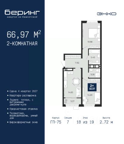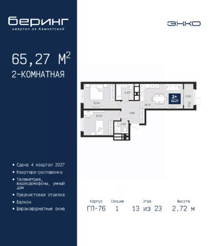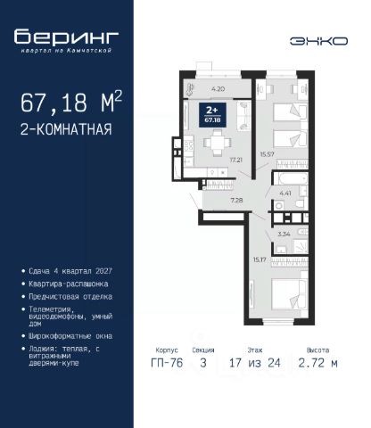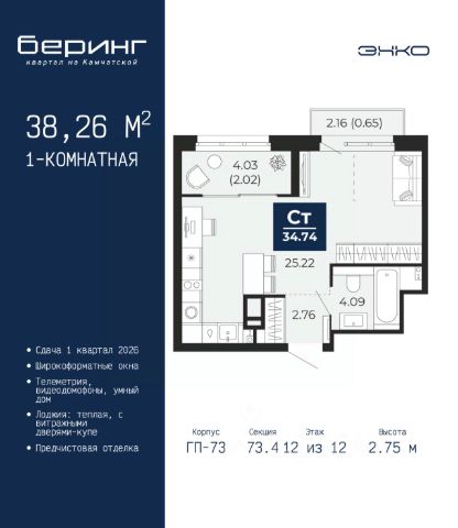 Продается 1-комн. квартира-студия от застройщика с предчистовой отделкой в ЖК "Беринг" на 5 этаже. Общая площадь: 34.32 кв.м., площадь гостиной 22.5 кв.м., из которых 5.79 кв.м. выделено под кухонную зону. Все окна выходят на одну сторону. В квартире одна лоджия, один совмещенный санузел. Высота потолков 2.72 м. Дом монолитный, черырехподъездный, переменной этажности, от 19 до 24 этажей. Квартира находится в 1-й секции высотой 23 этажа в корпусе ГП-76. На этаже 7 квартир. В подъезде 2 пассажирских и 1 грузовой лифт. Окончание строительства - 4 квартал 2027 года. Оформление сделки по договору долевого участия. Подобно знаменитому исследователю, мы чувствуем себя первооткрывателями этой локации. Хотим показать новую суть места, сформировать для вас жизненный опыт, которого ещё не было. Беринг — район зелёного цвета. Беринг — район, который откроется вам с другой стороны. Впечатлит новым уровнем комфорта и качеством жизни. Беринг — открытие на карте города. Первый квартал расположен в районе Тура, в границах улиц: Камчатская Западносибирская Энтузиастов. Вокруг уже есть всё для того, чтобы ежедневная рутина была лишь частью жизни и не доставляла дискомфорта. Школы и детские сады, магазины и аптеки, поликлиника, места для семейного отдыха, пеших и велопрогулок, и даже рыбалки. Масштабное озеленение дворов — визитная карточка ЭНКО и ваш оазис спокойствия, чтобы отвлечься от повседневности. Раскидистые деревья, кустарники, травы и цветы — осталось остановиться, вдохнуть и расслабиться, глядя на эту природную красоту. Стилистика подъездов продолжает концепцию Беринга, вдохновлённого Камчаткой: сдержанный, но при этом впечатляющий дизайн соседствует с удобством и функциональностью. #Zm6bBZ