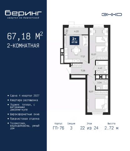 2-комн. квартира с предчистовой отделкой в ЖК "Беринг" на 18 этаже. Общая площадь: 62.63 кв.м., жилая: 25.12 кв.м., площадь просторной кухни-столовой: 18.31 кв.м. Комнаты изолированные, все окна выходят на одну сторону. В квартире одна лоджия, два совмещенных санузла. Высота потолков 2.72 м. Дом монолитный, многоподъездный, переменной этажности, от 17 до 24 этажей. Квартира находится в 6-й секции высотой 24 этажа в корпусе ГП-75. На этаже 6 квартир. В подъезде 2 пассажирских и 1 грузовой лифт. Окончание строительства - 4 квартал 2027 года. Оформление сделки по договору долевого участия. Подобно знаменитому исследователю, мы чувствуем себя первооткрывателями этой локации. Хотим показать новую суть места, сформировать для вас жизненный опыт, которого ещё не было. Беринг — район зелёного цвета. Беринг — район, который откроется вам с другой стороны. Впечатлит новым уровнем комфорта и качеством жизни. Беринг — открытие на карте города. Первый квартал расположен в районе Тура, в границах улиц: Камчатская Западносибирская Энтузиастов. Вокруг уже есть всё для того, чтобы ежедневная рутина была лишь частью жизни и не доставляла дискомфорта. Школы и детские сады, магазины и аптеки, поликлиника, места для семейного отдыха, пеших и велопрогулок, и даже рыбалки. Масштабное озеленение дворов — визитная карточка ЭНКО и ваш оазис спокойствия, чтобы отвлечься от повседневности. Раскидистые деревья, кустарники, травы и цветы — осталось остановиться, вдохнуть и расслабиться, глядя на эту природную красоту. Стилистика подъездов продолжает концепцию Беринга, вдохновлённого Камчаткой: сдержанный, но при этом впечатляющий дизайн соседствует с удобством и функциональностью. #Z69gcF