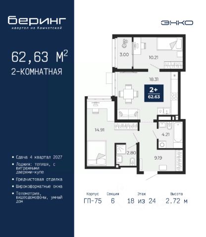 Торопитесь оформить бронирование на этих условиях, срок предложения ограничен! Стоимость квартиры указана со скидкой, ваша экономия составит 499,073 руб. Информация по телефону, мы вам все подробно расскажем. Просторная однокомнатная квартира-студия с предчистовой отделкой в ЖК "Беринг" на 11 этаже. Общая площадь: 31.39 кв.м., площадь гостиной 15.14 кв.м., из которых 5 кв.м. выделено под кухонную зону. Все окна выходят на одну сторону. В квартире одна лоджия, один совмещенный санузел. Высота потолков 2.75 м. Дом монолитный, многоподъездный, переменной этажности, от 9 до 21 этажей. Квартира находится в 5-й секции высотой 21 этаж в корпусе ГП-74. На этаже 7 квартир. В подъезде 1 пассажирский и 1 грузовой лифт. Окончание строительства - 1 квартал 2026 года. Оформление сделки по договору долевого участия. Подобно знаменитому исследователю, мы чувствуем себя первооткрывателями этой локации. Хотим показать новую суть места, сформировать для вас жизненный опыт, которого ещё не было. Беринг — район зелёного цвета. Беринг — район, который откроется вам с другой стороны. Впечатлит новым уровнем комфорта и качеством жизни. Беринг — открытие на карте города. Первый квартал расположен в районе Тура, в границах улиц: Камчатская Западносибирская Энтузиастов. Вокруг уже есть всё для того, чтобы ежедневная рутина была лишь частью жизни и не доставляла дискомфорта. Школы и детские сады, магазины и аптеки, поликлиника, места для семейного отдыха, пеших и велопрогулок, и даже рыбалки. Масштабное озеленение дворов — визитная карточка ЭНКО и ваш оазис спокойствия, чтобы отвлечься от повседневности. Раскидистые деревья, кустарники, травы и цветы — осталось остановиться, вдохнуть и расслабиться, глядя на эту природную красоту. Стилистика подъездов продолжает концепцию Беринга, вдохновлённого Камчаткой: сдержанный, но при этом впечатляющий дизайн соседствует с удобством и функциональностью. #2MdDuB