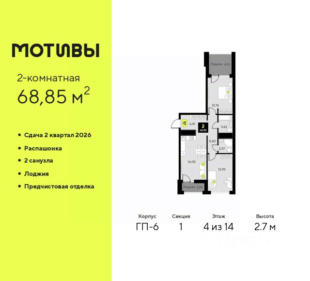Двухкомнатная квартира с предчистовой отделкой в ЖК "Мотивы" на 14 этаже. Общая площадь: 53.95 кв.м., жилая: 24.24 кв.м., площадь просторной кухни-столовой: 20.1 кв.м. Комнаты изолированные, все окна выходят на одну сторону. В квартире одна лоджия, один совмещенный санузел. Высота потолков 2.7 м. Квартира будет сдаваться с предчистовой отделкой White Box: выровнены и оштукатурены стены, проведено электричество и отопление, установлены радиаторы. Вы также можете приобрести квартиру с ремонтом от застройщика, представленным в трех цветовых решениях Scandi, Wood и Coffee и включающим ламинат, обои под покраску, двери, натяжной потолок и санузел с сантехникой. При желании вы можете заказать отделку под ключ, варианты возможных решений представлены в альбоме фотографий. Дом монолитный, многоподъездный, переменной этажности, от 5 до 14 этажей. Квартира находится в 5-й секции высотой 14 этажей в корпусе ГП-4. На этаже 5 квартир. В подъезде 1 пассажирский и 1 грузовой лифт. На сегодняшний день строительство окончено, дом сдан в 4 квартале 2024 года. Оформление сделки по договору купли-продажи. Закрытая от автомобилей территория, безопасный двор и камеры видеонаблюдения - гаранты вашего спокойствия. Квартал будет располагать богатой инфраструктурой: на первых этажах разместятся магазины, пекарни, кофейни, пункты выдачи, аптеки, детские центры, цветочные салоны и многое другое, что сделает жизнь поистине комфортной. Рядом находится парк общей площадью почти 5000 м², в котором располагаются локации для игр и отдыха жителей, здесь можно совершить утреннюю пробежку или прогуляться после рабочего дня. В парке есть зона воркаута с тренажерами для взрослых, игровые комплексы с горками и канатный комплекс для детей разных возрастов, качели и лавочки для отдыха, площадки для командных видов спорта и для панна-футбола. В ЖК "Мотивы" всё продумано до мелочей: светлые холлы входных групп, оформленные в едином стиле, просторные колясочные, лапомойки для питомцев. На территории комплекса находятся 2 8-ми этажных паркинга и более 1000 м/м на открытой парковке. Жилой комплекс находится в одном из экологически благоприятных районов Тюмени, недалеко от Плехановского бора. При этом до центра города можно добраться за 15 минут, а до международного аэропорта Рощино за 13 минут. Окончание строительства: ГП 1, 2, 3, 4 сдача до конца 2024 года, ГП 6, 7, 8 сдача 2 квартал 2026 года. #ZWAcAT