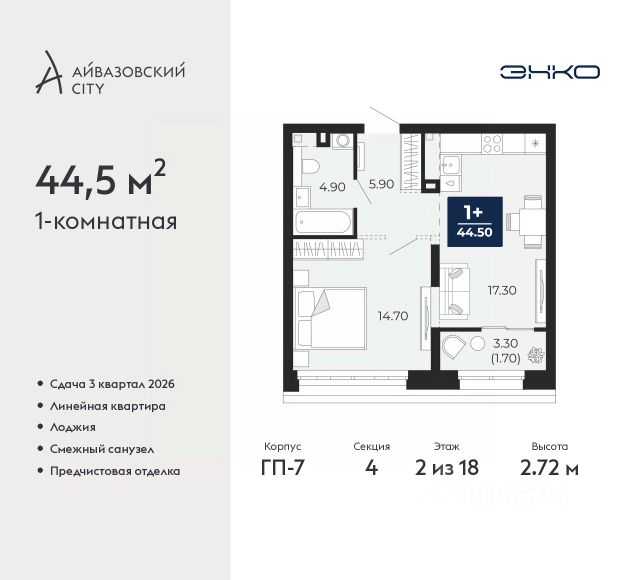 Продается 1-комн. квартира с предчистовой отделкой в ЖК "Айвазовский City" на 2 этаже. Общая площадь: 41.2 кв.м., жилая: 11.3 кв.м., площадь просторной кухни-столовой: 20.5 кв.м. Все окна выходят на одну сторону. В квартире один совмещенный санузел. Высота потолков 2.7 м. Дом монолитный, многоподъездный, переменной этажности, от 14 до 24 этажей. Квартира находится в 5-й секции высотой 14 этажей в корпусе ГП-8. На этаже 5 квартир. В подъезде 1 пассажирский и 1 грузовой лифт. Окончание строительства - 3 квартал 2026 года. Оформление сделки по договору долевого участия. Новый жилой район располагается в живописном месте на берегу Туры в центральной части города. Принципиально новое пространство для жизни в центре современного города для тех, чьи мечты сбываются, кто нацелен на постоянный рост, перемены к лучшему для себя и своих близких. Каждая деталь Айвазовский City вдохновляет и заряжает на новые свершения: авторская архитектура, сбалансированная продуманная инфраструктура, дизайнерские дворы со спортивными и детскими площадками, парковые зоны с фонтанами, водный канал, украшающий центральный прогулочный маршрут района и многое другое. В 2019 года проект стал лауреатом престижной премии Urban Awards 2019 в номинации "Лучший строящийся региональный жилой комплекс бизнес-класса". Главная особенность Айвазовский City - соседство разных архитектурных школ в рамках одного дома. Изысканная классика, выразительная эклектика и оригинальный модерн - жить в одном из таких домов настоящий повод для гордости. Айвазовский City это идеальное сочетание комфорта, технологий и развитой инфраструктуры. Вход в подъезд возможен с улицы и со двора. Отправляясь на работу или за покупками, жители могут выйти с внешней стороны дома, а для прогулки с ребенком со стороны двора. Экологически чистые материалы и энергосберегающие технологии, качественное освещение общественных зон, видеонаблюдение по всей территории жилого района (в том числе в подъездах, лифтах и в подземном паркинге), закрытые дворы с доступом только для жителей Айвазовский City. Часть домов в Айвазовский City будут оснащены подземным паркингом. Востребованный в нашем климатическом поясе формат хранения автомобилей защитит собственность владельца в любое время года. Аккредитация в банках: ОАО "Альфа-Банк", ПАО Банк "ВТБ", ПАО "Газпромбанк", "Сбербанк России", ПАО Банк "ФК Открытие" и других. #24Ae07
