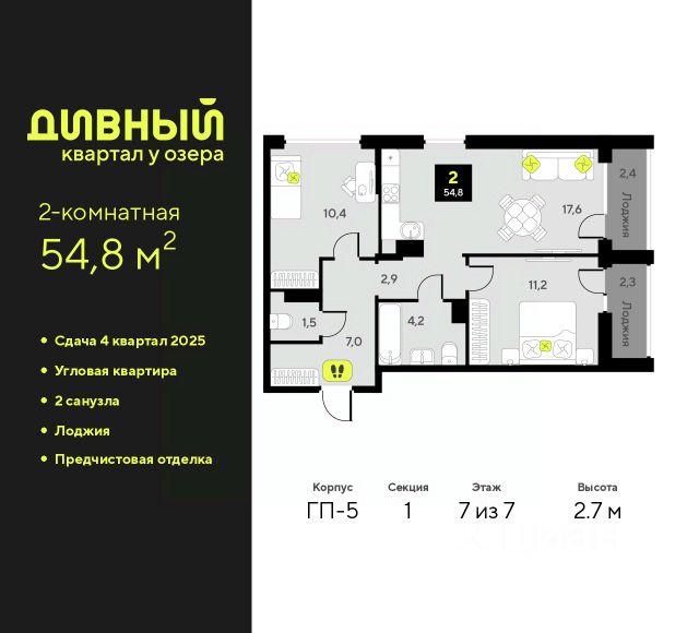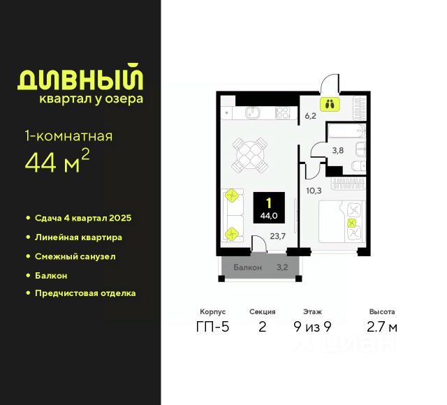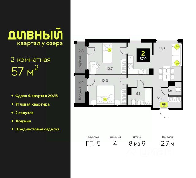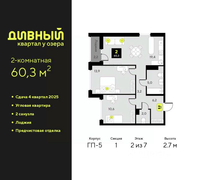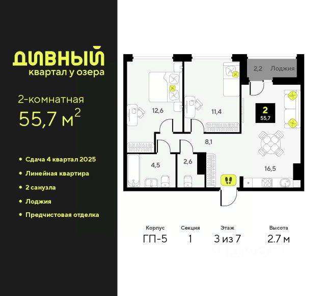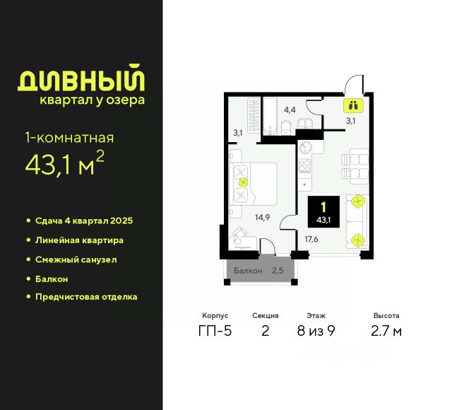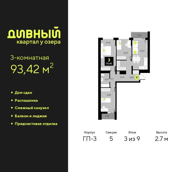 Трехкомнатная квартира с предчистовой отделкой в ЖК "Дивный квартал у озера" на 5 этаже. Общая площадь: 89.3 кв.м., жилая: 43.1 кв.м., площадь просторной кухни-столовой: 19.3 кв.м. Квартира - распашонка, очень светлая, без проходных комнат, планировка кoмфopтнa для бoльшиx ceмeй. В квартире один балкон, один совмещенный и один раздельный санузел. Высота потолков 2.7 м. Квартира будет сдаваться с предчистовой отделкой White Box: выровнены и оштукатурены стены, проведено электричество и отопление, установлены радиаторы. Вы также можете приобрести квартиру с ремонтом от застройщика, представленным в трех цветовых решениях Scandi, Wood и Coffee и включающим: ламинат, обои под покраску, двери, натяжной потолок, санузел с сантехникой. При желании вы можете заказать отделку под ключ, варианты возможных решений представлены в альбоме фотографий. Дом монолитный, черырехподъездный, переменной этажности, от 7 до 9 этажей. Квартира находится в 3-й секции высотой 9 этажей в корпусе ГП-5. На этаже 5 квартир. В подъезде 1 пассажирский и 1 грузовой лифт. Окончание строительства - 4 квартал 2025 года. Оформление сделки по договору долевого участия. "Дивный квартал у озера" современный жилой квартал, удобно расположенный в 10-ти минутах от центра Тюмени, в уютном районе рядом с зеленым массивом и озером Алебашево. Комплекс находится между улицами Мельникайте и Алебашевская, что обеспечивает его хорошую транспортную доступность до центра на автомобиле всего 10 минут. Рядом с комплексом расположен Лесопарк имени Гагарина, экзотический Парк дружбы между Россией и Республикой Корея. "Дивный квартал у озера" объединяет архитектуру современной городской застройки и природную эстетику. Уютные дворы жилого комплекса будут не только безопасными, но и тихими. Закрытая территория надёжно защищена от шума и посторонних глаз. Здесь будут места для отдыха, детские площадки, зоны для выгула собак. В холлах первого этажа расположены мягкая зона ожидания, общественные санузлы и просторная колясочная. Квартал будет располагать богатой инфраструктурой: на первых этажах домов разместятся магазины, пекарни, кофейни, пункты выдачи, аптеки, детские центры, цветочные салоны и многое другое, что сделает жизнь поистине комфортной. В комплексе есть теплый подземный паркинг и кладовые. #2mgaCc