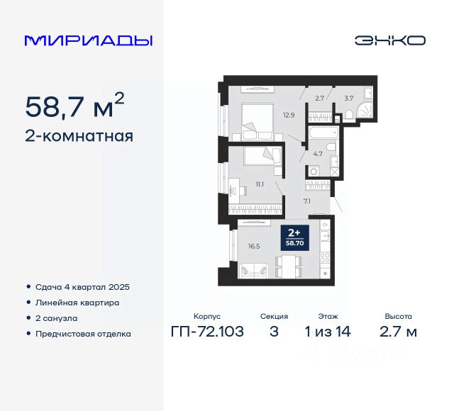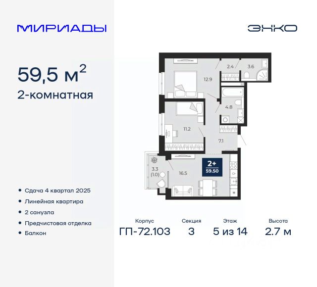 2-комн. квартира от застройщика с предчистовой отделкой в ЖК "Мириады" на 2 этаже. Общая площадь: 57.1 кв.м., жилая: 21.6 кв.м., площадь просторной кухни-столовой: 17 кв.м. Угловая квартира, очень светлая, естественная вентиляция при открытии окон. В квартире одна лоджия, два совмещенных санузла. Высота потолков 2.7 м. Дом монолитный, трехподъездный, переменной этажности, от 14 до 16 этажей. Квартира находится в 1-й секции высотой 16 этажей в корпусе ГП-72.103. На этаже 8 квартир. В подъезде 1 пассажирский и 1 грузовой лифт. Окончание строительства - 4 квартал 2025 года. Оформление сделки по договору долевого участия. Вселенная бесконечных историй. Ранее невиданный Тюмени масштаб: территория 240 гектаров и 1 650 000 м² застройки. Мириады это город масштабных перемен и больших возможностей. Город зеленых рощ и зеркальных озер. Город для работы, учебы и развлечений. Город для детей и их родителей. Город для всех и каждого. Проект расположен в районе Мыс рядом с ТРЦ "Тюмень Сити Молл" в границах улицы Тимофея Чаркова, Тобольского тракта и объездной дороги. Срок полного освоения территории - до 2034 года. #zmtEmC