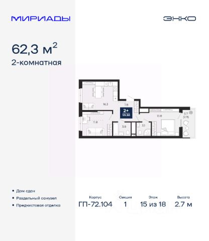 2-комн. квартира с европланировкой и предчистовой отделкой в ЖК "Мириады" на 1 этаже. Общая площадь: 40.7 кв.м., жилая: 20.7 кв.м., суммарная площадь гостиной-столовой с кухонной зоной: 15.4 кв.м. Европланировка, за счет большой площади кухни-гостиной квартира выглядит просторной и очень удобна для жизни. Комнаты изолированные, все окна выходят на одну сторону. В квартире одна лоджия, один совмещенный санузел. Высота потолков 2.7 м. Дом монолитный, двухподъездный, переменной этажности, от 14 до 18 этажей. Квартира находится во 2-й секции высотой 14 этажей в корпусе ГП-72.104. На этаже 8 квартир. В подъезде 1 пассажирский и 1 грузовой лифт. На сегодняшний день строительство окончено, дом сдан в 4 квартале 2025 года. Оформление сделки по договору купли-продажи. Вселенная бесконечных историй. Ранее невиданный Тюмени масштаб: территория 240 гектаров и 1 650 000 м² застройки. Мириады это город масштабных перемен и больших возможностей. Город зеленых рощ и зеркальных озер. Город для работы, учебы и развлечений. Город для детей и их родителей. Город для всех и каждого. Проект расположен в районе Мыс рядом с ТРЦ "Тюмень Сити Молл" в границах улицы Тимофея Чаркова, Тобольского тракта и объездной дороги. Срок полного освоения территории - до 2034 года. #Z6TdCv