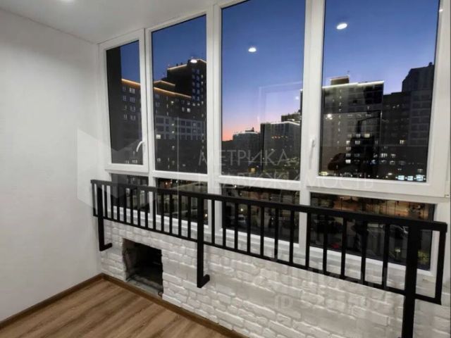 Просторная кухня правильной формы, гостиная 17, м² с окнами на две стороны и выходом на лоджию.