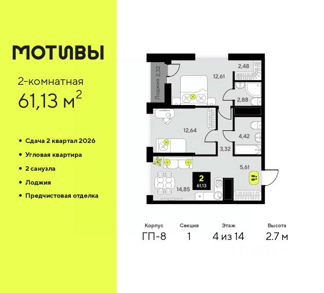 Дом монолитный, черырехподъездный, переменной этажности, от 12 до 14 этажей. Квартира находится в 5-й секции высотой 14 этажей в корпусе ГП-3. На этаже 5 квартир. В подъезде 1 пассажирский и 1 грузовой лифт. На сегодняшний день строительство окончено, дом сдан в 4 квартале 2024 года. Оформление сделки по договору купли-продажи.