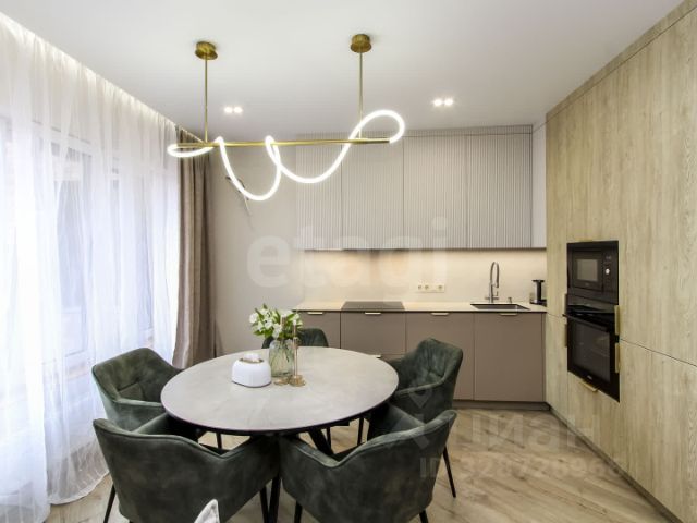 Просторная кухня-гостиная оборудована всей встроенной техникой Bosch: холодильник, варочная панель, вытяжка, духовой шкаф, микроволновая печь и посудомоечная машина, кондиционер "Haier", с эффектом драконий глаз, телевизор "Samsumg". стол раскладной, 4 стула, современный диван.