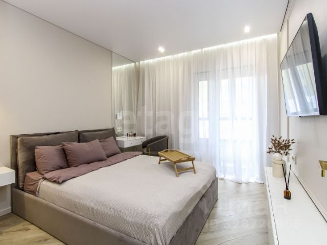 Родительская мастер-спальня с собственной гардеробной с продуманными зонами хранения, что делает пространство максимально функциональным. Здесь же установлена кровать с подъёмным механизмом и большой телевизор.