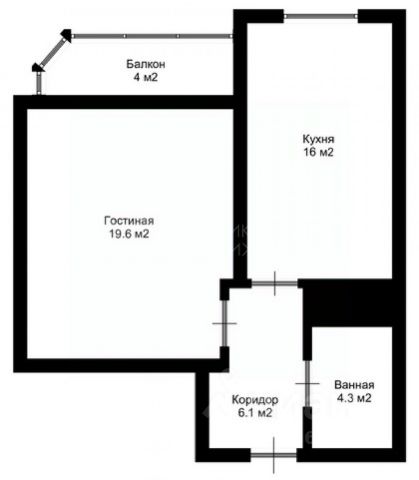 В квартире обустроены кухня-гостиная правильной прямоугольной формы 22.5м2, спальная комната 11.5м2, прихожая 9.5м2, ванная комната 4.2м2, туалет 3м2, гардеробная комната 6.5м2. Дополнительно к площади квартиры идет большой балкон площадью 6.5м2. Общая площадь квартира + балкон составляет 64м2.