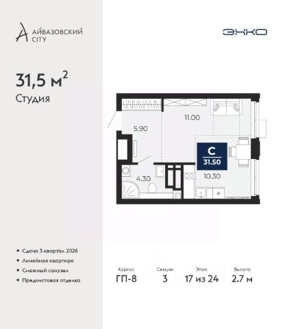 Просторная однокомнатная квартира-студия с предчистовой отделкой в ЖК "Прео" на 12 этаже. Общая площадь: 34.51 кв.м., площадь гостиной 23.97 кв.м., из которых 5 кв.м. выделено под кухонную зону. Все окна выходят на одну сторону. В квартире один балкон, один совмещенный санузел. Высота потолков 2.7 м.