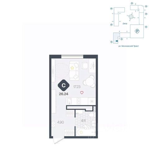 Продаётся квартира площадью 24.30 м2 в жилом комплексе "Айрис". Квартира находится на 3 этаже дома, который будет введен в эксплуатацию в 3 квартале 2027 года. Жилая площадь квартиры 9.50 м2, площадь просторной кухни — 5.80 м2. Среди особенностей планировки — изолированные комнаты с окнами на одну сторону, 1 совмещённый санузел. Жилой комплекс "Айрис" — это: фиджитал-квартал в Тюмени дома высотой от 7 до 25 этажей квартиры с системой "Умный дом" цифровые технологии как элемент благоустройства Срок сдачи — III кв. 2027 Окружение В нескольких минутах ходьбы от дома — парк "Комарово" с волейбольной площадкой, открытым кинотеатром, зонами для барбекю и катком. Неподалеку от Airis находится центр иппотерапии, где можно покататься на лошадях и взять уроки верховой езды. На территории Airis появится собственный парк с прогулочными аллеями. Инфраструктура В 5-10 минутах от квартала открыты 2 детских сада и гимназия. На шопинг можно отправиться в торговые комплексы "Колумб" и "Кристалл" — они находятся недалеко от дома. Благоустройство Уютный двор — приватное пространство для жителей. В беседках можно будет почитать книгу в тишине, а в тени деревьев устроиться на пикник. На крыше многоуровневого паркинга будет лаунж-зона с кинотеатром, баскетбольная площадка и воркаут-пространство, где можно позаниматься с виртуальным тренером — достаточно отсканировать код. Лобби Интерьеры лобби выполнены в пастельных тонах с элементами фиджитал-решений. Для отдыха и ожидания гостей создана лаунж-зона. Также есть гостевые санузлы. Колясочные Возвращайтесь налегке после прогулки с малышом — оставить коляску можно в специальном помещении на первом этаже. Кладовые Для сезонных и габаритных вещей предусмотрены отдельные кладовые на цокольном этаже. В каждом помещении уже проведено электричество и выполнена стяжка пола. Паркинг На территории — два многоуровневых наземных паркинга. Один из них примыкает к домам — из него можно напрямую пройти в парадные. Планировки Планировки квартала — от компактной студии до сити-хауса с собственным палисадником — соответствуют любым жизненным сценариям. Можно выбрать квартиры с террасами и готовыми дизайнерскими интерьерами.