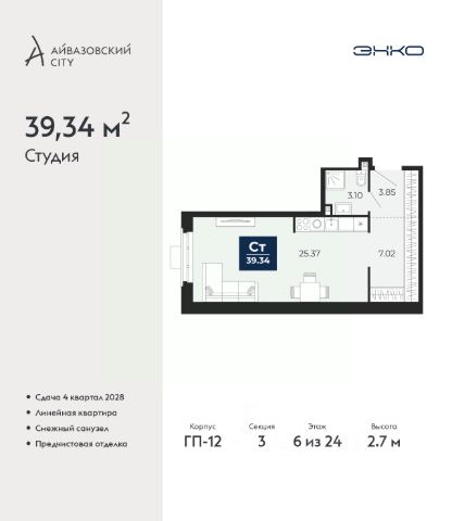 1-комн. квартира-студия с предчистовой отделкой в ЖК "Айвазовский City" на 4 этаже. Общая площадь: 40.34 кв.м., площадь гостиной 26.05 кв.м., из которых 5 кв.м. выделено под кухонную зону. Угловая квартира, идеально подойдет любителям тишины и панорамных видов. В квартире один совмещенный санузел. Высота потолков 2.7 м. Дом монолитный, многоподъездный, высотой 24 этажа. Квартира находится в 4-й секции в корпусе ГП-13. На этаже 6 квартир. В подъезде 1 пассажирский и 1 грузовой лифт. Окончание строительства - 4 квартал 2027 года. Оформление сделки по договору долевого участия. Новый жилой район располагается в живописном месте на берегу Туры в центральной части города. Принципиально новое пространство для жизни в центре современного города для тех, чьи мечты сбываются, кто нацелен на постоянный рост, перемены к лучшему для себя и своих близких. Каждая деталь Айвазовский City вдохновляет и заряжает на новые свершения: авторская архитектура, сбалансированная продуманная инфраструктура, дизайнерские дворы со спортивными и детскими площадками, парковые зоны с фонтанами, водный канал, украшающий центральный прогулочный маршрут района и многое другое. В 2019 года проект стал лауреатом престижной премии Urban Awards 2019 в номинации "Лучший строящийся региональный жилой комплекс бизнес-класса". Главная особенность Айвазовский City - соседство разных архитектурных школ в рамках одного дома. Изысканная классика, выразительная эклектика и оригинальный модерн - жить в одном из таких домов настоящий повод для гордости. Айвазовский City это идеальное сочетание комфорта, технологий и развитой инфраструктуры. Вход в подъезд возможен с улицы и со двора. Отправляясь на работу или за покупками, жители могут выйти с внешней стороны дома, а для прогулки с ребенком со стороны двора. Экологически чистые материалы и энергосберегающие технологии, качественное освещение общественных зон, видеонаблюдение по всей территории жилого района (в том числе в подъездах, лифтах и в подземном паркинге), закрытые дворы с доступом только для жителей Айвазовский City. Часть домов в Айвазовский City будут оснащены подземным паркингом. Востребованный в нашем климатическом поясе формат хранения автомобилей защитит собственность владельца в любое время года. Аккредитация в банках: ПАО Банк "ВТБ", ОАО "Альфа-Банк", "Сбербанк России", ПАО "Газпромбанк", АО "ДОМ.РФ" и других. #zm89Af Продам квартиру-студию 40 м2 (квадратных метров) в Тюменской области.