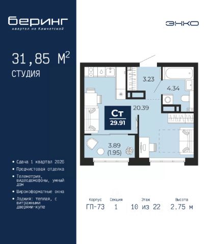 Продается 1-комн. квартира-студия от застройщика с предчистовой отделкой в ЖК "Беринг" на 7 этаже. Общая площадь: 32.98 кв.м., площадь гостиной 21.63 кв.м., из которых 5 кв.м. выделено под кухонную зону. Все окна выходят на одну сторону. В квартире одна лоджия, один совмещенный санузел. Высота потолков 2.75 м.