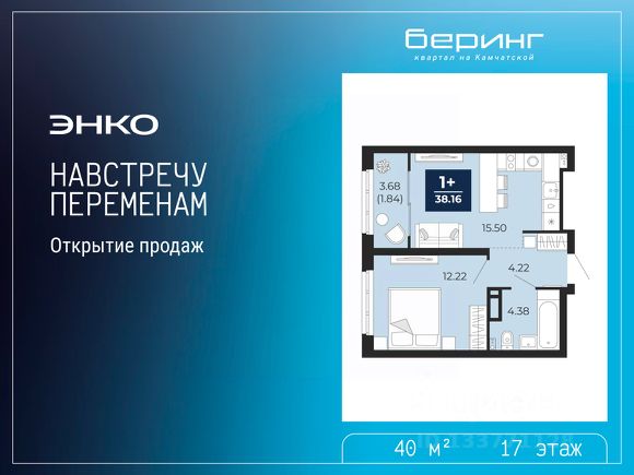 Продается однокомнатная квартира с предчистовой отделкой в ЖК "Беринг" на 17 этаже. Общая площадь: 40 кв.м., жилая: 12.22 кв.м., площадь просторной кухни-столовой: 15.5 кв.м. Все окна выходят на одну сторону. В квартире одна лоджия, один совмещенный санузел. Высота потолков 2.75 м.