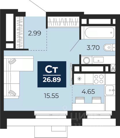 Однокомнатная квартира-студия в ЖК "Айвазовский" на 21 этаже. Общая площадь: 26.89 кв.м., площадь гостиной 20.2 кв.м., из которых 4.65 кв.м. выделено под кухонную зону. Все окна выходят на одну сторону. В квартире один совмещенный санузел. Высота потолков 2.7 м. Дом монолитный, многоподъездный, высотой 24 этажа. Квартира находится во 2-й секции в корпусе ГП-13. На этаже 6 квартир. В подъезде 1 пассажирский и 1 грузовой лифт. Окончание строительства - 4 квартал 2027 года. Оформление сделки по договору долевого участия. Новый жилой район располагается в живописном месте на берегу Туры в центральной части города. Принципиально новое пространство для жизни в центре современного города для тех, чьи мечты сбываются, кто нацелен на постоянный рост, перемены к лучшему для себя и своих близких. Каждая деталь ЖК "Айвазовский" вдохновляет и заряжает на новые свершения: авторская архитектура, сбалансированная продуманная инфраструктура, дизайнерские дворы со спортивными и детскими площадками, парковые зоны с фонтанами, водный канал, украшающий центральный прогулочный маршрут района и многое другое. В 2019 года проект стал лауреатом престижной премии Urban Awards 2019 в номинации "Лучший строящийся региональный жилой комплекс бизнес-класса". Главная особенность Айвазовский - соседство разных архитектурных школ в рамках одного дома. Изысканная классика, выразительная эклектика и оригинальный модерн - жить в одном из таких домов настоящий повод для гордости. Айвазовский это идеальное сочетание комфорта, технологий и развитой инфраструктуры. Вход в подъезд возможен с улицы и со двора. Отправляясь на работу или за покупками, жители могут выйти с внешней стороны дома, а для прогулки с ребенком со стороны двора. Экологически чистые материалы и энергосберегающие технологии, качественное освещение общественных зон, видеонаблюдение по всей территории жилого района (в том числе в подъездах, лифтах и в подземном паркинге), закрытые дворы с доступом только для жителей Айвазовский. Часть домов в Айвазовский будут оснащены подземным паркингом. Востребованный в нашем климатическом поясе формат хранения автомобилей защитит собственность владельца в любое время года. Аккредитация в банках: "Сбербанк России", ПАО "Газпромбанк", ПАО Банк "ВТБ", ОАО "Альфа-Банк", ПАО АКБ "Абсолют Банк" и других. #Z6DEbC