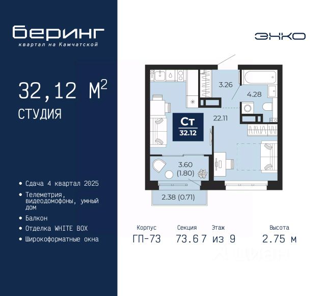 Продается 1-комн. квартира-студия от застройщика в ЖК "Беринг" на 3 этаже. Квартира без отделки, полностью готова к чистовой отделке и дальнейшему ремонту. Общая площадь: 29.02 кв.м., площадь гостиной 15.14 кв.м., из которых 5 кв.м. выделено под кухонную зону. Все окна выходят на одну сторону. В квартире один совмещенный санузел. Высота потолков 2.75 м. Дом монолитный, многоподъездный, переменной этажности, от 9 до 21 этажей. Квартира находится в 74.5-й секции высотой 21 этаж в корпусе ГП-74. На этаже 7 квартир. В подъезде 1 пассажирский и 1 грузовой лифт. Окончание строительства - 4 квартал 2025 года. Оформление сделки по договору долевого участия. Подобно знаменитому исследователю, мы чувствуем себя первооткрывателями этой локации. Хотим показать новую суть места, сформировать для вас жизненный опыт, которого ещё не было. Беринг — район зелёного цвета. Беринг — район, который откроется вам с другой стороны. Впечатлит новым уровнем комфорта и качеством жизни. Беринг — открытие на карте города. Первый квартал расположен в районе Тура, в границах улиц: Камчатская Западносибирская Энтузиастов. Вокруг уже есть всё для того, чтобы ежедневная рутина была лишь частью жизни и не доставляла дискомфорта. Школы и детские сады, магазины и аптеки, поликлиника, места для семейного отдыха, пеших и велопрогулок, и даже рыбалки. Масштабное озеленение дворов — визитная карточка ЭНКО и ваш оазис спокойствия, чтобы отвлечься от повседневности. Раскидистые деревья, кустарники, травы и цветы — осталось остановиться, вдохнуть и расслабиться, глядя на эту природную красоту. Стилистика подъездов продолжает концепцию Беринга, вдохновлённого Камчаткой: сдержанный, но при этом впечатляющий дизайн соседствует с удобством и функциональностью. #2UsWAi