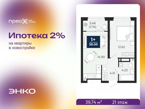 Успейте забронировать, пока действует скидка, период акции ограничен! Стоимость квартиры указана со скидкой, ваша экономия составит 1,036,756 руб. Информация по телефону, мы вам все подробно расскажем. 1-комн. квартира с предчистовой отделкой в ЖК "Прео" на 21 этаже. Общая площадь: 39.74 кв.м., жилая: 12.62 кв.м., площадь просторной кухни-столовой: 14.9 кв.м. Все окна выходят на одну сторону. В квартире одна лоджия, один совмещенный санузел. Высота потолков 2.7 м. Дом монолитный, трехподъездный, переменной этажности, от 14 до 23 этажей. Квартира находится во 2-й секции высотой 23 этажа в корпусе 206. На этаже 10 квартир. В подъезде 1 пассажирский и 1 грузовой лифт. Строительство завершено, дом сдан в 1 квартале 2026 года. Оформление сделки по договору купли-продажи. Преображенский — один из самых привлекательных районов для жизни! Это полностью самостоятельный жилой район с точки зрения инфраструктуры. Преображенский находится между Московским и Червишевским трактами в квартале улиц Закалужская — Вьюжная — Александра Протозанова. Не нужно ждать, когда появится инфраструктура — переезжайте на всё готовое. Вблизи расположены действующие школа и детский сад. В этом году откроется еще один сад, а в следующем году — школа. По соседству с Преображенским запланировано строительство городского парка "Комарово" площадью 38 гектар. За 10 минут можно доехать на автомобиле до крупных ТРЦ: "Лента", "Кристалл", "Леруа Мерлен", "Метро" и "Ашан". С 2018 года в районе открыт Соседский центр — пространство, созданное для формирования добрососедской среды, совместного досуга, общения и реализации соседских инициатив. Здесь проходят встречи соседей, а также сами жители района организовывают мероприятия. Организатором такого события может стать любой желающий. В квартирах выполнена качественная предчистовая отделка. Гладкие стены с финишным выравниванием по маякам. Ровный потолок для установки натяжного потолка. Установлены пятикамерные окна с двойным стеклопакетом (3 стекла). Дизайнерские холлы с видеонаблюдением, безбарьерным и прозрачным входом всегда светло и спокойно. На первом этаже есть просторные колясочные, где все жители могут оставлять свои коляски и велосипеды. В Преображенском есть всё, что нужно для активного отдыха и занятий спортом. Мы сделали большое футбольное поле с безопасным покрытием. Также установили хоккейный корт, который оборудован по всем необходимым стандартам. Во дворах можно делать упражнения на специальных площадках с турниками. Весь район мы обустроили велодорожками, которые связаны в единый маршрут. У нас есть сухие фонтаны, бьющие из земли, деревья, веревки, сетки, скалодром, газон, песок и резинка — осталось просто дать своему ребенку право на свободную игру. По-настоящему хорошие дворы — это те, которые дети предпочитают соцсетям и телевизору. Аккредитация в банках: ПАО "Газпромбанк", ПАО "Банк Уралсиб", ОАО "Альфа-Банк", "Сбербанк России", ПАО Банк "ВТБ" и других.