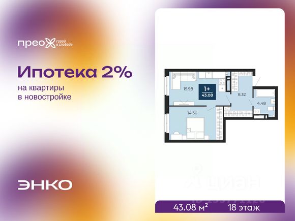 Спешите забронировать на этих условиях, предложение ограничено! Стоимость квартиры указана со скидкой, ваша экономия составит 615,000 руб. Звоните, наши менеджеры вам все расскажут. Продается 1-комн. квартира от застройщика с предчистовой отделкой в ЖК "Прео" на 18 этаже. Общая площадь: 43.08 кв.м., жилая: 14 кв.м., площадь просторной кухни-столовой: 15.98 кв.м. Все окна выходят на одну сторону. В квартире один совмещенный санузел. Высота потолков 2.7 м. Квартира находится в корпусе 203. Дом монолитный, одноподъездный, высотой 24 этажа. На этаже 14 квартир. В подъезде 2 грузовых лифта. На сегодняшний день строительство окончено, дом сдан в 4 квартале 2024 года. Оформление сделки по договору купли-продажи. Преображенский — один из самых привлекательных районов для жизни! Это полностью самостоятельный жилой район с точки зрения инфраструктуры. Преображенский находится между Московским и Червишевским трактами в квартале улиц Закалужская — Вьюжная — Александра Протозанова. Не нужно ждать, когда появится инфраструктура — переезжайте на всё готовое. Вблизи расположены действующие школа и детский сад. В этом году откроется еще один сад, а в следующем году — школа. По соседству с Преображенским запланировано строительство городского парка "Комарово" площадью 38 гектар. За 10 минут можно доехать на автомобиле до крупных ТРЦ: "Лента", "Кристалл", "Леруа Мерлен", "Метро" и "Ашан". С 2018 года в районе открыт Соседский центр — пространство, созданное для формирования добрососедской среды, совместного досуга, общения и реализации соседских инициатив. Здесь проходят встречи соседей, а также сами жители района организовывают мероприятия. Организатором такого события может стать любой желающий. В квартирах выполнена качественная предчистовая отделка. Гладкие стены с финишным выравниванием по маякам. Ровный потолок для установки натяжного потолка. Установлены пятикамерные окна с двойным стеклопакетом (3 стекла). Дизайнерские холлы с видеонаблюдением, безбарьерным и прозрачным входом всегда светло и спокойно. На первом этаже есть просторные колясочные, где все жители могут оставлять свои коляски и велосипеды. В Преображенском есть всё, что нужно для активного отдыха и занятий спортом. Мы сделали большое футбольное поле с безопасным покрытием. Также установили хоккейный корт, который оборудован по всем необходимым стандартам. Во дворах можно делать упражнения на специальных площадках с турниками. Весь район мы обустроили велодорожками, которые связаны в единый маршрут. У нас есть сухие фонтаны, бьющие из земли, деревья, веревки, сетки, скалодром, газон, песок и резинка — осталось просто дать своему ребенку право на свободную игру. По-настоящему хорошие дворы — это те, которые дети предпочитают соцсетям и телевизору. Аккредитация в банках: ПАО "Банк Уралсиб", ПАО "Газпромбанк", "Сбербанк России", ПАО Банк "ВТБ", ОАО "Альфа-Банк" и других.