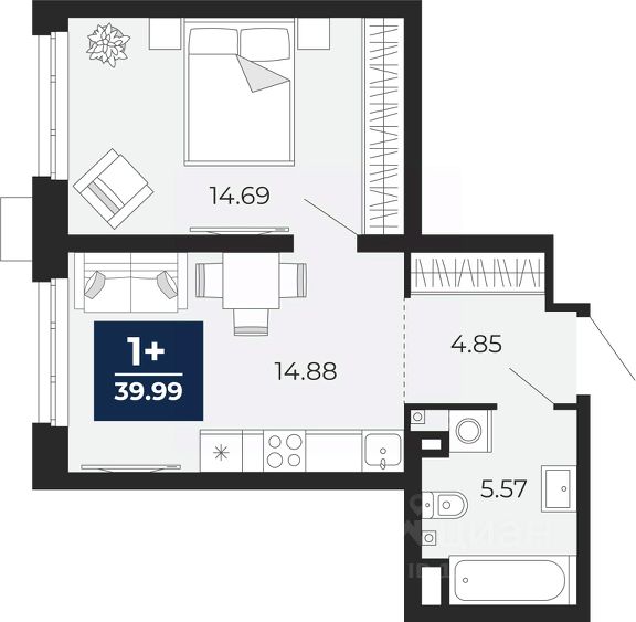 Квартира с кухней-гостиной и двумя спальнями в Доме у озера. Особенности планировки: балкон, предчистовая отделка, разнесённые спальни.