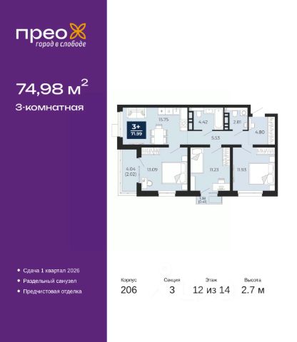 Продается трехкомнатная квартира с предчистовой отделкой в ЖК "Прео" на 12 этаже. Общая площадь: 74.98 кв.м., жилая: 36.25 кв.м., площадь просторной кухни-столовой: 15.75 кв.м. Угловая квартира, идеально подойдет любителям тишины и панорамных видов. В квартире один балкон и одна лоджия, один раздельный санузел. Высота потолков 2.7 м.