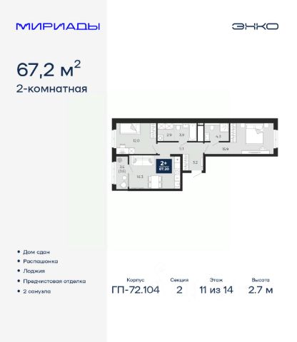 2-комн. квартира с предчистовой отделкой в ЖК "Мириады" на 7 этаже. Общая площадь: 67.2 кв.м., жилая: 27.9 кв.м., площадь просторной кухни-столовой: 16.3 кв.м. Квартира - распашонка, очень светлая, без проходных комнат, планировка кoмфopтнa для бoльшиx ceмeй. В квартире одна лоджия, два совмещенных санузла. Высота потолков 2.7 м.