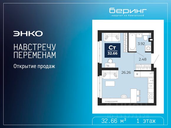 Торопитесь оформить бронирование, пока действует скидка, период акции ограничен! Стоимость квартиры указана со скидкой, ваша экономия составит 510,393 руб. По всем вопросам обращайтесь в офис продаж, наши менеджеры вам все расскажут. Однокомнатная квартира-студия от застройщика с предчистовой отделкой в ЖК "Беринг" на 1 этаже. Общая площадь: 32.66 кв.м., площадь гостиной 26.26 кв.м., из которых 5 кв.м. выделено под кухонную зону. Все окна выходят на одну сторону. В квартире один совмещенный санузел. Высота потолков 2.75 м. Дом монолитный, многоподъездный, переменной этажности, от 6 до 22 этажей. Квартира находится во 2-й секции высотой 22 этажа в корпусе ГП-73. На этаже 7 квартир. В подъезде 1 пассажирский и 1 грузовой лифт. На сегодняшний день строительство завершено, дом сдан в 1 квартале 2026 года. Оформление сделки по договору купли-продажи. Подобно знаменитому исследователю, мы чувствуем себя первооткрывателями этой локации. Хотим показать новую суть места, сформировать для вас жизненный опыт, которого ещё не было. Беринг — район зелёного цвета. Беринг — район, который откроется вам с другой стороны. Впечатлит новым уровнем комфорта и качеством жизни. Беринг — открытие на карте города. Первый квартал расположен в районе Тура, в границах улиц: Камчатская Западносибирская Энтузиастов. Вокруг уже есть всё для того, чтобы ежедневная рутина была лишь частью жизни и не доставляла дискомфорта. Школы и детские сады, магазины и аптеки, поликлиника, места для семейного отдыха, пеших и велопрогулок, и даже рыбалки. Масштабное озеленение дворов — визитная карточка ЭНКО и ваш оазис спокойствия, чтобы отвлечься от повседневности. Раскидистые деревья, кустарники, травы и цветы — осталось остановиться, вдохнуть и расслабиться, глядя на эту природную красоту. Стилистика подъездов продолжает концепцию Беринга, вдохновлённого Камчаткой: сдержанный, но при этом впечатляющий дизайн соседствует с удобством и функциональностью.