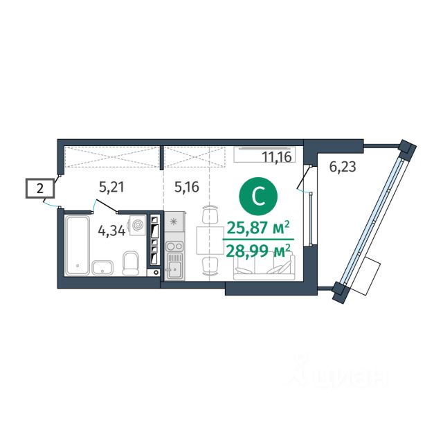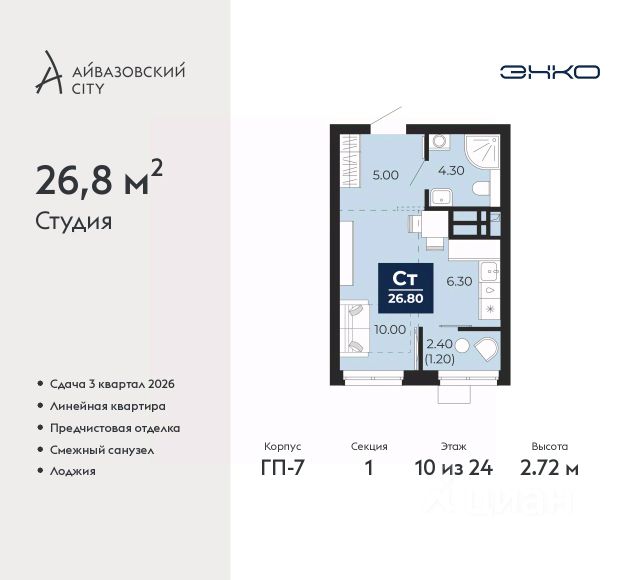 1-комн. квартира-студия от застройщика с предчистовой отделкой в ЖК "Айвазовский City" на 10 этаже. Общая площадь: 29.48 кв.м., площадь гостиной 22.67 кв.м., из которых 5.59 кв.м. выделено под кухонную зону. Все окна выходят на одну сторону. В квартире один совмещенный санузел. Высота потолков 2.7 м. Дом монолитный, многоподъездный, высотой 24 этажа. Квартира находится во 2-й секции в корпусе ГП-13. На этаже 6 квартир. В подъезде 1 пассажирский и 1 грузовой лифт. Окончание строительства - 4 квартал 2027 года. Оформление сделки по договору долевого участия. Новый жилой район располагается в живописном месте на берегу Туры в центральной части города. Принципиально новое пространство для жизни в центре современного города для тех, чьи мечты сбываются, кто нацелен на постоянный рост, перемены к лучшему для себя и своих близких. Каждая деталь Айвазовский City вдохновляет и заряжает на новые свершения: авторская архитектура, сбалансированная продуманная инфраструктура, дизайнерские дворы со спортивными и детскими площадками, парковые зоны с фонтанами, водный канал, украшающий центральный прогулочный маршрут района и многое другое. В 2019 года проект стал лауреатом престижной премии Urban Awards 2019 в номинации "Лучший строящийся региональный жилой комплекс бизнес-класса". Главная особенность Айвазовский City - соседство разных архитектурных школ в рамках одного дома. Изысканная классика, выразительная эклектика и оригинальный модерн - жить в одном из таких домов настоящий повод для гордости. Айвазовский City это идеальное сочетание комфорта, технологий и развитой инфраструктуры. Вход в подъезд возможен с улицы и со двора. Отправляясь на работу или за покупками, жители могут выйти с внешней стороны дома, а для прогулки с ребенком со стороны двора. Экологически чистые материалы и энергосберегающие технологии, качественное освещение общественных зон, видеонаблюдение по всей территории жилого района (в том числе в подъездах, лифтах и в подземном паркинге), закрытые дворы с доступом только для жителей Айвазовский City. Часть домов в Айвазовский City будут оснащены подземным паркингом. Востребованный в нашем климатическом поясе формат хранения автомобилей защитит собственность владельца в любое время года. Аккредитация в банках: ПАО "Газпромбанк", "Сбербанк России", ПАО Банк "ВТБ", ОАО "Альфа-Банк", ПАО АКБ "Абсолют Банк" и других. #Z694Vw