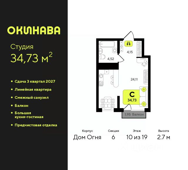 Продается 1-комн. квартира-студия с предчистовой отделкой в ЖК "Айвазовский City" на 10 этаже. Общая площадь: 29.48 кв.м., площадь гостиной 22.67 кв.м., из которых 5.59 кв.м. выделено под кухонную зону. Все окна выходят на одну сторону. В квартире один совмещенный санузел. Высота потолков 2.7 м. Дом монолитный, многоподъездный, высотой 24 этажа. Квартира находится во 2-й секции в корпусе ГП-13. На этаже 6 квартир. В подъезде 1 пассажирский и 1 грузовой лифт. Окончание строительства - 4 квартал 2027 года. Оформление сделки по договору долевого участия. Новый жилой район располагается в живописном месте на берегу Туры в центральной части города. Принципиально новое пространство для жизни в центре современного города для тех, чьи мечты сбываются, кто нацелен на постоянный рост, перемены к лучшему для себя и своих близких. Каждая деталь Айвазовский City вдохновляет и заряжает на новые свершения: авторская архитектура, сбалансированная продуманная инфраструктура, дизайнерские дворы со спортивными и детскими площадками, парковые зоны с фонтанами, водный канал, украшающий центральный прогулочный маршрут района и многое другое. В 2019 года проект стал лауреатом престижной премии Urban Awards 2019 в номинации "Лучший строящийся региональный жилой комплекс бизнес-класса". Главная особенность Айвазовский City - соседство разных архитектурных школ в рамках одного дома. Изысканная классика, выразительная эклектика и оригинальный модерн - жить в одном из таких домов настоящий повод для гордости. Айвазовский City это идеальное сочетание комфорта, технологий и развитой инфраструктуры. Вход в подъезд возможен с улицы и со двора. Отправляясь на работу или за покупками, жители могут выйти с внешней стороны дома, а для прогулки с ребенком со стороны двора. Экологически чистые материалы и энергосберегающие технологии, качественное освещение общественных зон, видеонаблюдение по всей территории жилого района (в том числе в подъездах, лифтах и в подземном паркинге), закрытые дворы с доступом только для жителей Айвазовский City. Часть домов в Айвазовский City будут оснащены подземным паркингом. Востребованный в нашем климатическом поясе формат хранения автомобилей защитит собственность владельца в любое время года. Аккредитация в банках: ОАО "Альфа-Банк", ПАО Банк "ВТБ", "Сбербанк России", ПАО "Газпромбанк", ПАО "Промсвязьбанк" и других. #2Mgw8w