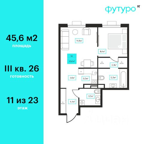 Продаётся 1-комнатная квартира в строящемся доме (Дом 6к1), срок сдачи: III-кв. 2026, общей площадью 45.6 кв.м., на 11 этаже. Новый жилой комплекс "Futuro" от застройщика "newton" расположен в г. Тюмень на Ставропольской улице.