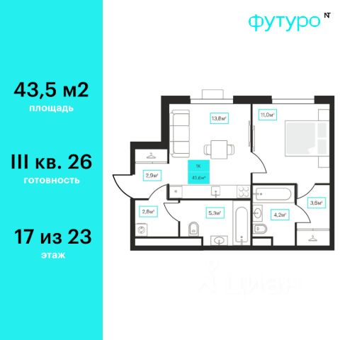 Продаётся 1-комнатная квартира в строящемся доме (Дом 6к1), срок сдачи: III-кв. 2026, общей площадью 45.6 кв.м., на 6 этаже. Новый жилой комплекс "Futuro" от застройщика "newton" расположен в г. Тюмень на Ставропольской улице.